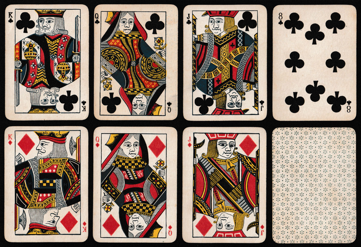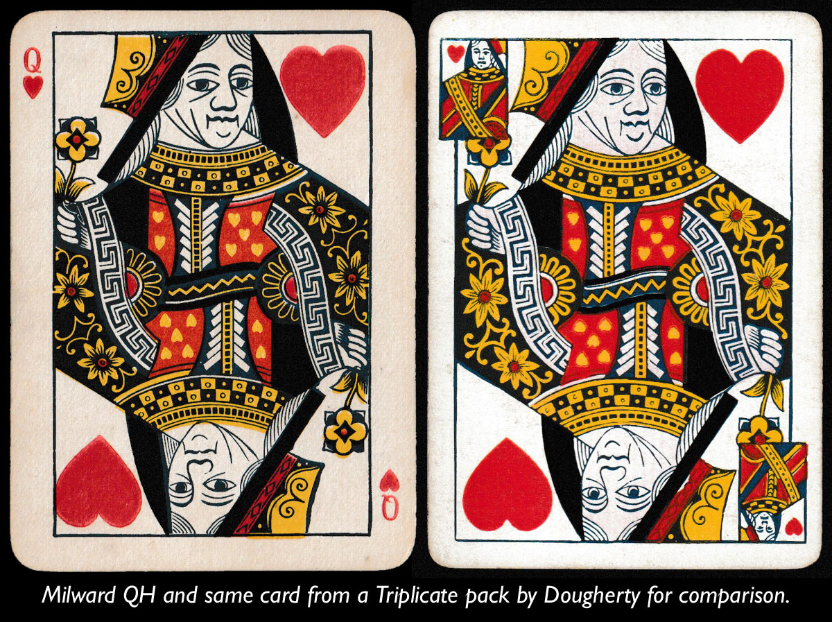According to The Hochman Encyclopedia of American Playing Cards, M.F. Milward was making playing cards in Chicago in the 1890s. This is believed to be the only design they ever produced, although it is known with two different Jokers (sadly lacking from this pack). The court cards bear a strong resemblance to those found in Dougherty’s Triplicate pack of 1878. Note especially the Queen of Hearts, who normally faces in the opposite direction, and the Jack of Spades, who looks particularly grumpy thanks to a strong mouth line. The simple back design in pale green is made up of dots and six-pointed asterisks.