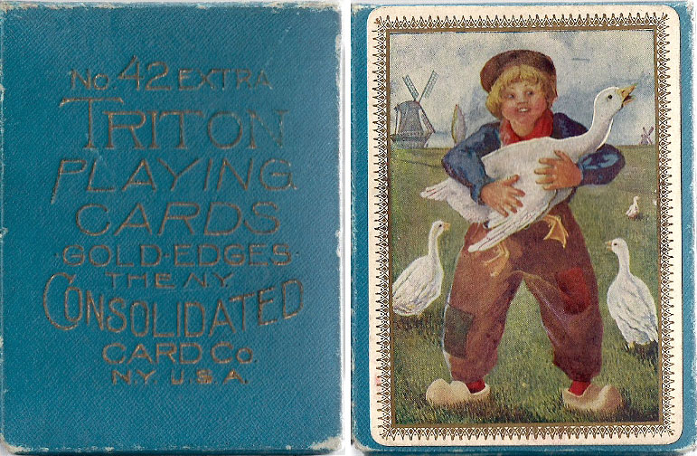 The Triton No.42 brand was first introduced by the N.Y. Consolidated Card Co. in around 1890 as one of their more expensive brands and part of their Squeezer range, with perfect slip. The cards were advertised as double enamelled. There have been at least three different versions of the Triton deck, with different Jokers, different styles of court cards and slight differences in the lettering on the Ace of Spades and/or Joker. Triton is a mythological Greek god, the messenger of the sea. He is usually represented as a merman, having the upper body of a human and the tail of a fish, as seen here on the Ace of Spades and Joker. Triton cards were aimed to be preferred by the leading clubs and Army and Navy.