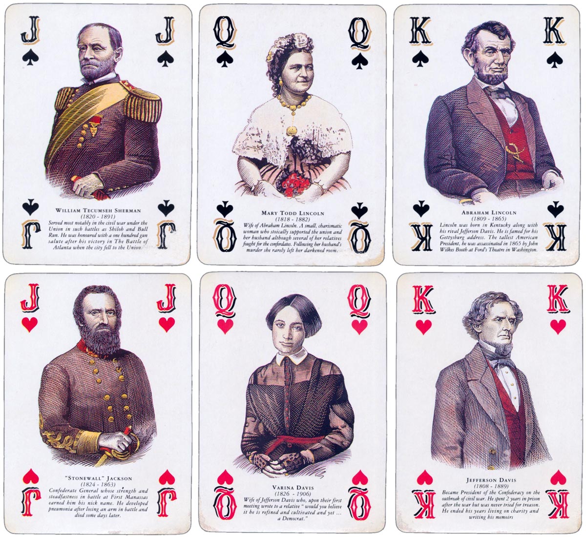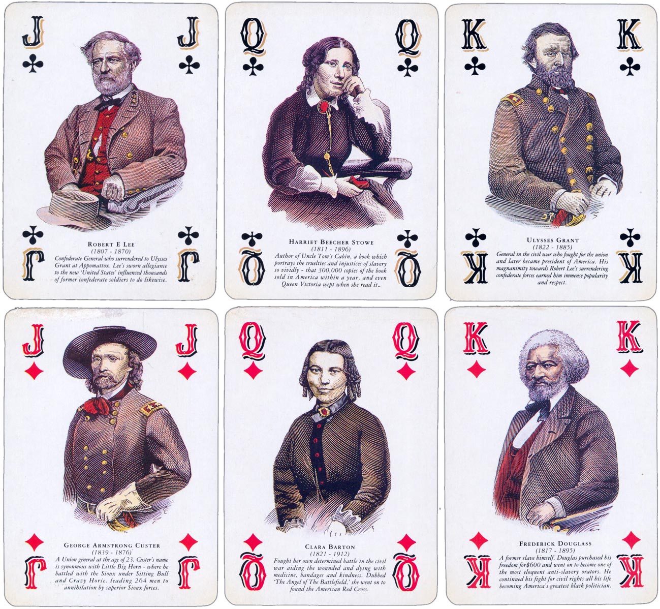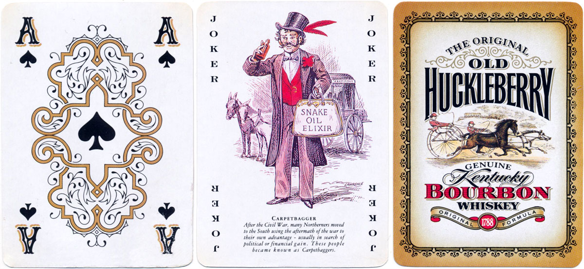 A modern 'retro' pack depicting characters from American history on the courts, and with elaborate aces, with advertisement for “The Original Old Huckleberry Genuine Kentucky Bourbon Whiskey” on the reverse. The perception of the vintage whiskey is reinforced by the historical flavour of the artwork and typography, which is also seen in the label.