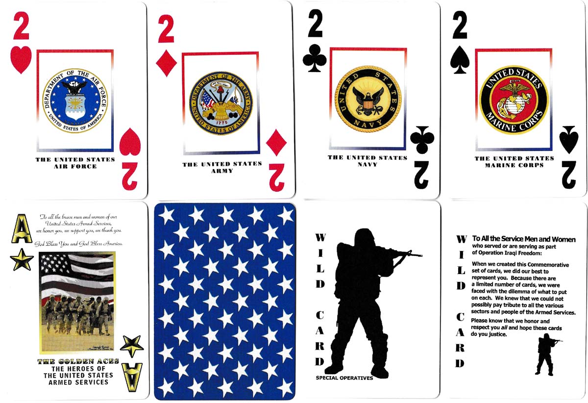 This pack by American Art Classics, Inc. eulogises the American service men and women who served or were then currently serving as part of Operation Iraqi Freedom. The aces and court cards present photos of individual political, military, naval or Air Force leaders. The 2 of each suit carries the emblems of the Marine Corps, Army, Navy and Air Force, while the remaining pip cards display photos of various armaments and military equipment (missiles, tanks, helicopters, etc.). This pack is a bridge-size pack (63 x 88 mm.) and has 2 wild cards (jokers), one card called “The Golden Ace” dedicated to the brave men and women of our United States Armed Services, and a fourth extra card, one side of which displays the Stars and the other side the Stripes of the US flag.