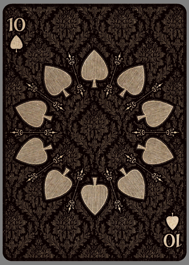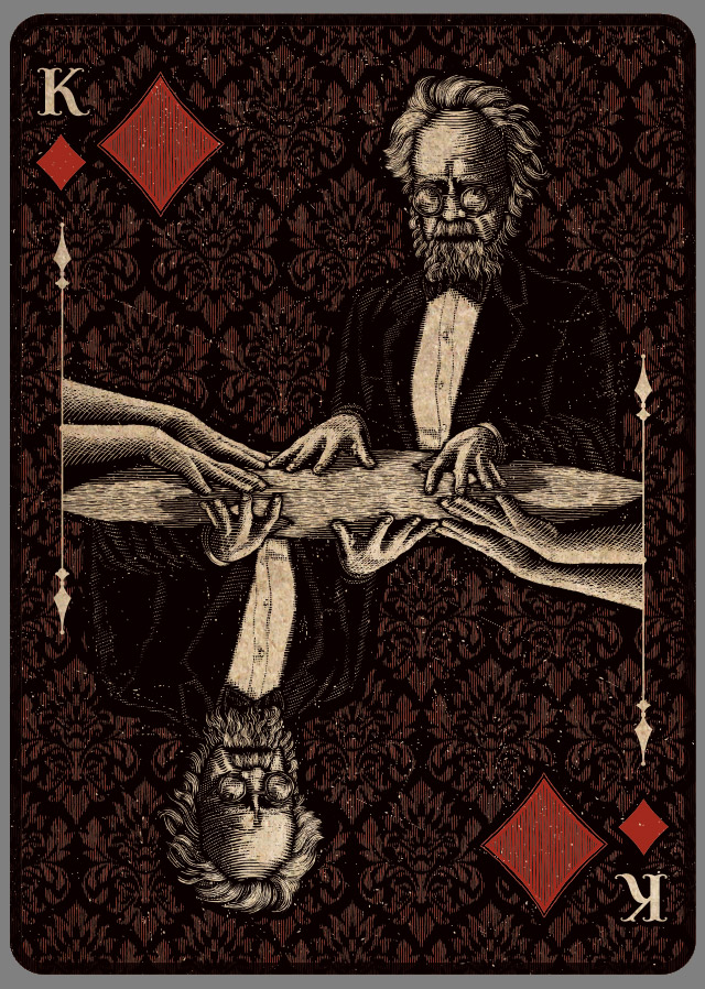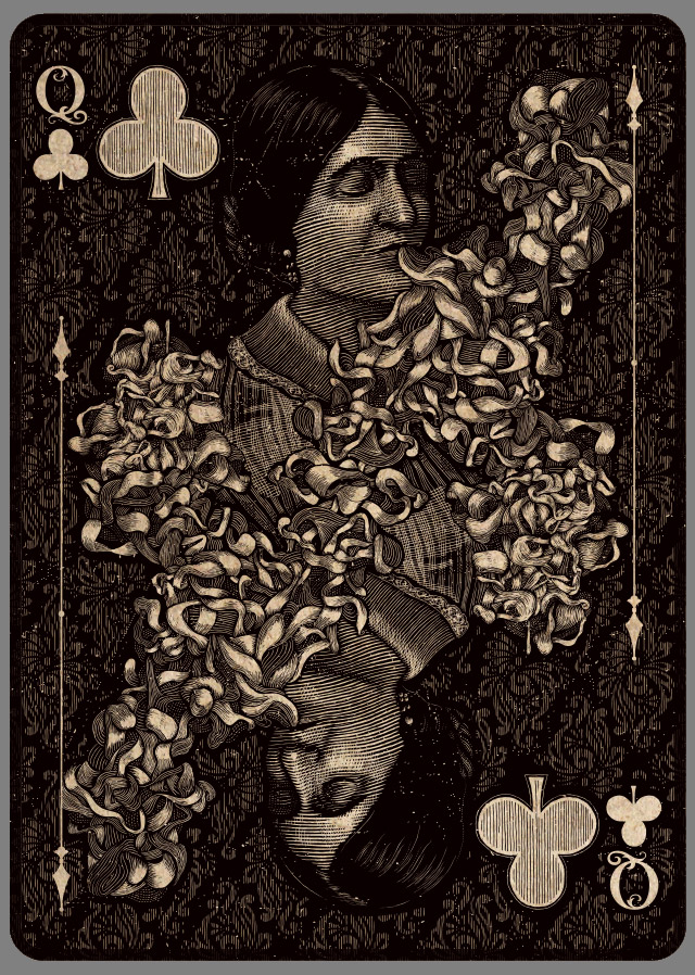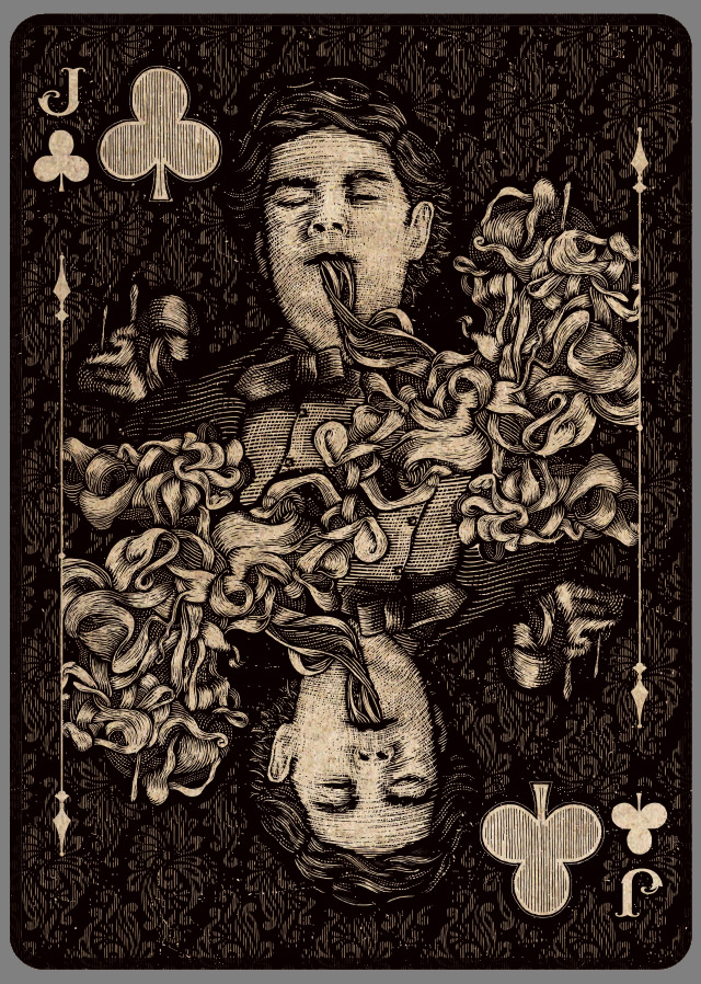 My biggest struggle along those lines was the Clubs suit. From the beginning I had identified different aspects of the spiritualist movement for different suits. Spirit photography, seances, automatic writing were all easy enough, but ectoplasm for clubs was a real challenge. During the heydey of the movement, mediums would manifest a spirit through their body orifices. From what I can tell it pretty much looks like rolled up gauze that they would spit out or otherwise reveal. As a parlor trick I'm sure it was convincing at the time, but as artwork it posed a really substantial creative challenge. The question became wether to sanitize history or be true to what actually was done. I chose to move forward with it, and employed a design motif that is in part ribbon-like, otherwise indiscernible as to what is actually being viewed.