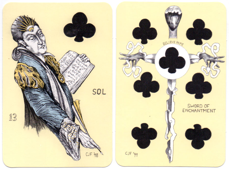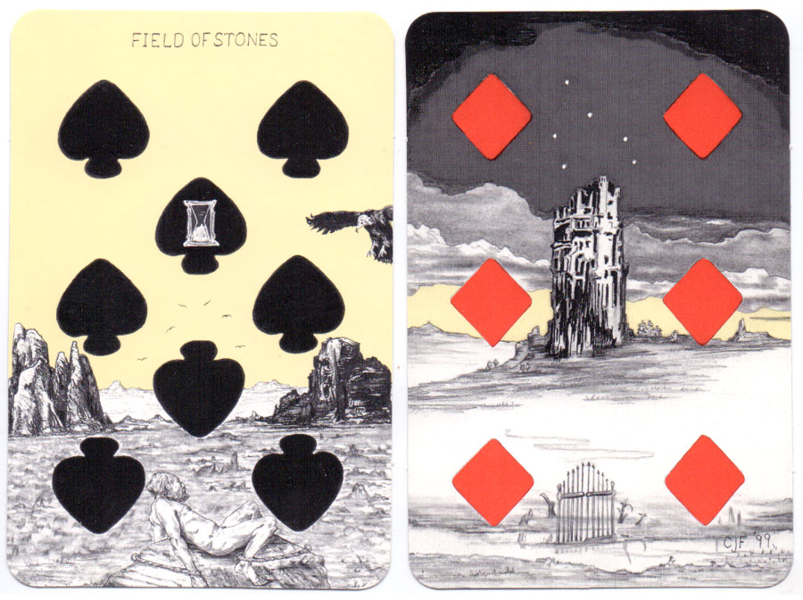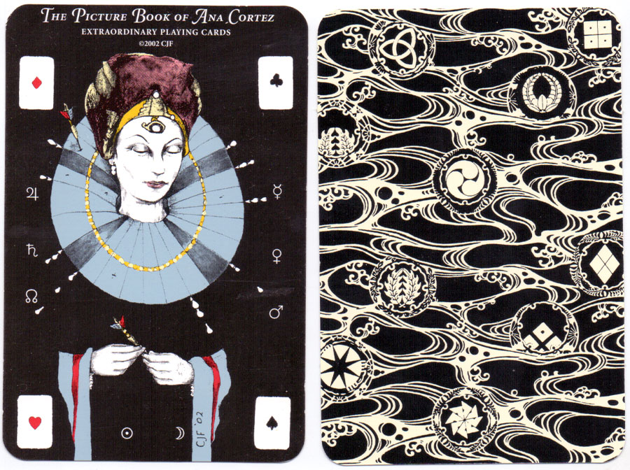 Above: the Picture Book of Ana Cortez, a pen and ink style illuminated pack of playing cards designed to facilitate divination by Charles J. Freeman (1941-2010). 52 cards + title card first published by Two Sisters Press, 2002. The deck was reprinted by U.S. Games Systems and is available now from the publisher and Amazon. It is a smaller version than the original printing, a true "playing card size." The first publishing, by Two Sisters Press, is available only to members of the online Workshop offered through www.anacortez.com, as they are extremely limited.