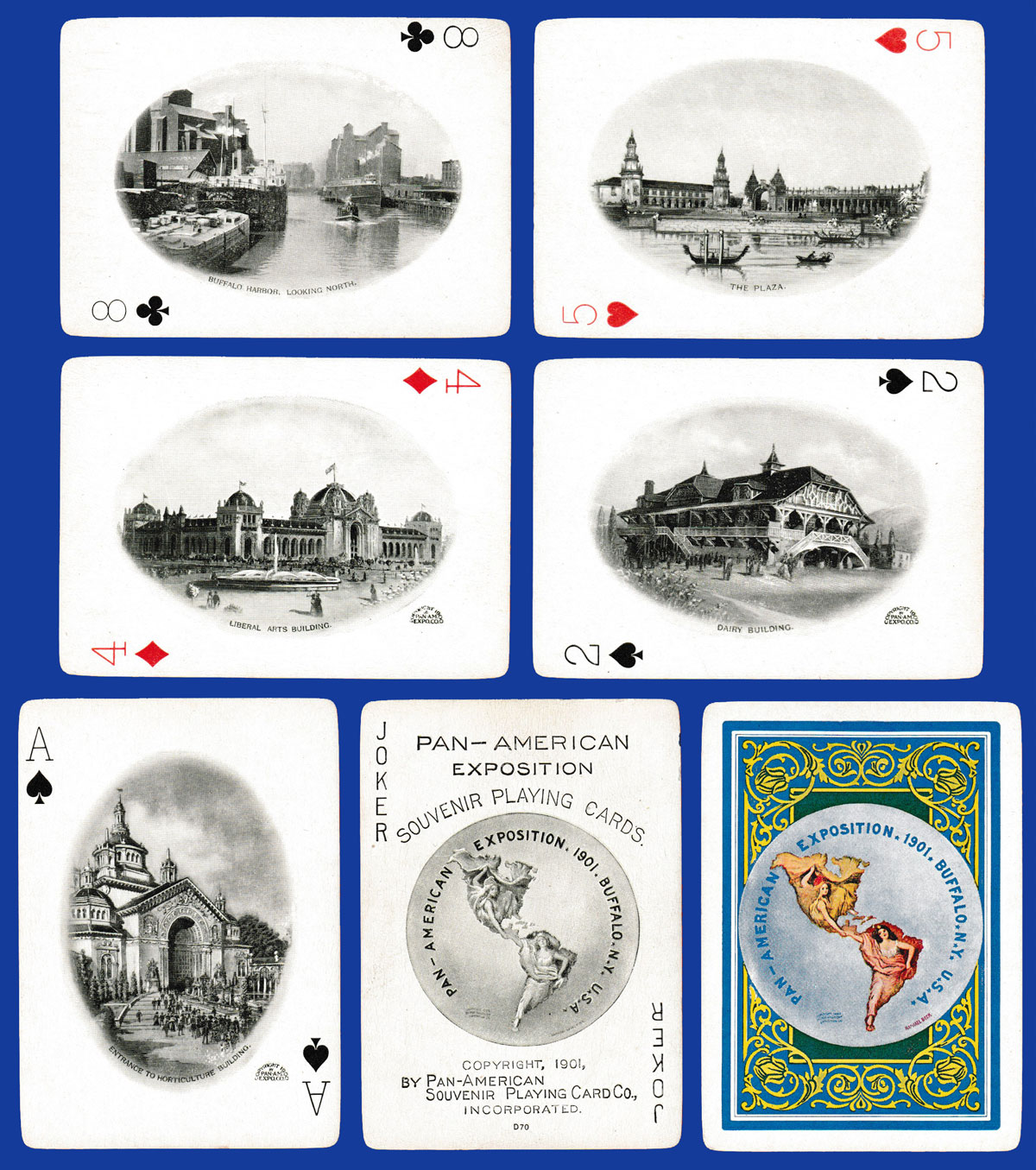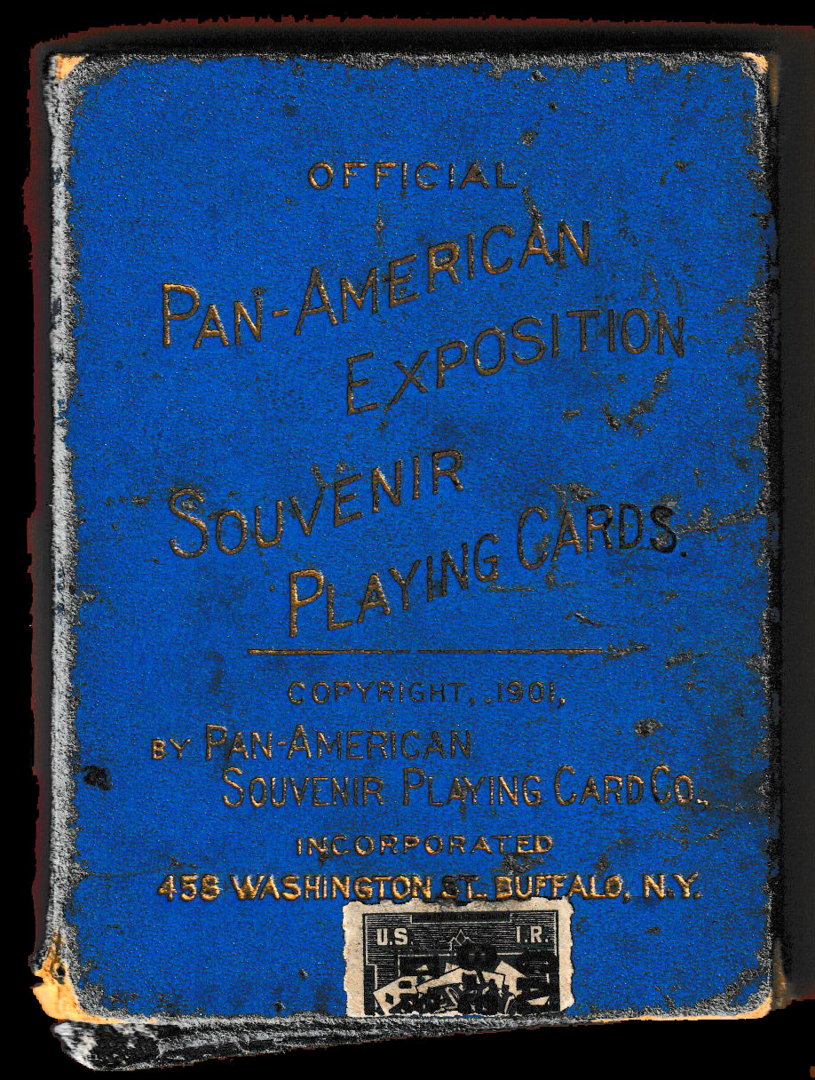 Above: Pan-American Exposition Souvenir Playing Cards published by the Pan-American Souvenir Playing Card Co., Inc., Buffalo, NY, USA, 1901. 52 cards + 1 Joker in telescopic box. Size: 62.5 x 88 mm. Copyright, 1901, by Pan-American Souvenir Playing Card Co., Incorporated, 458 Washington St., Buffalo, N.Y.