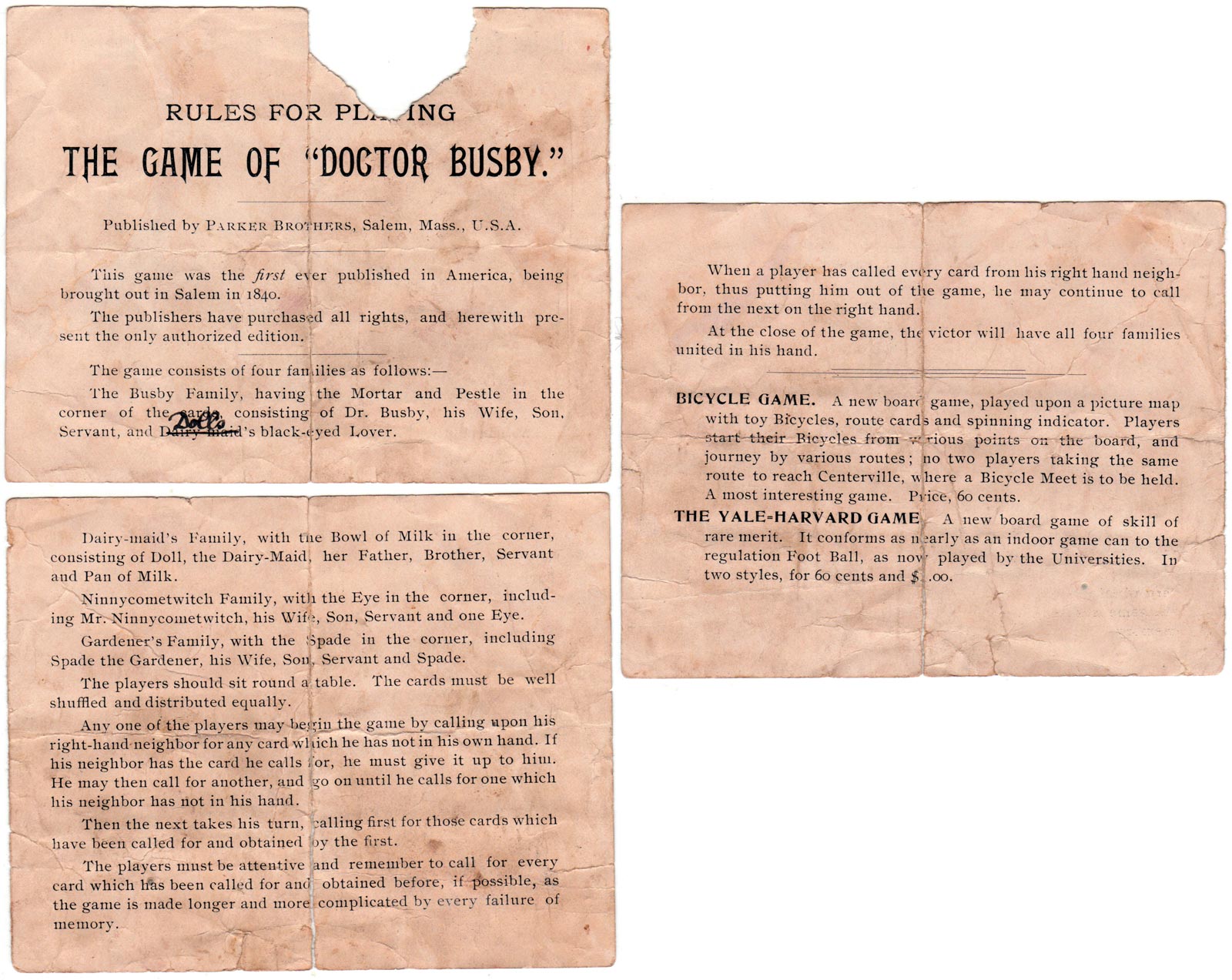 The Game of “Doctor Busby” was the first American game to sell successfully. It is believed that it started the whole game craze in the country, beginning in 1843. The game was probably designed by Anne W. Abbott, of Salem, Massachusetts, and was first published by the W. and S.B. Ives Company in that city. Parker Brothers acquired the copyrignts in 1887 although versions exist by other game publishers of the period, sometimes with alternative spellings.