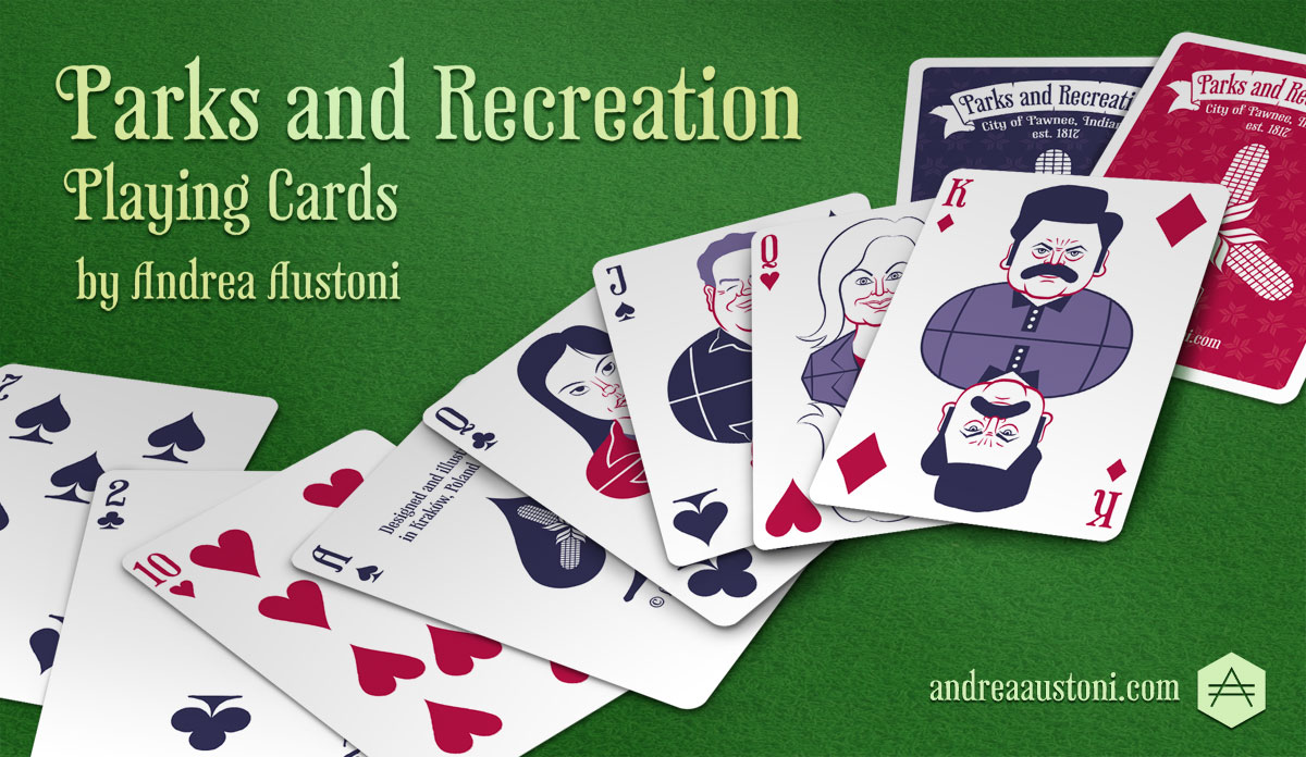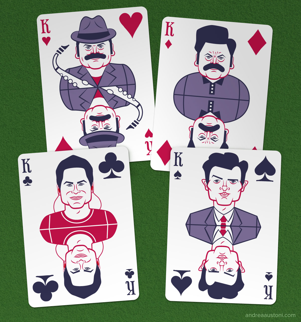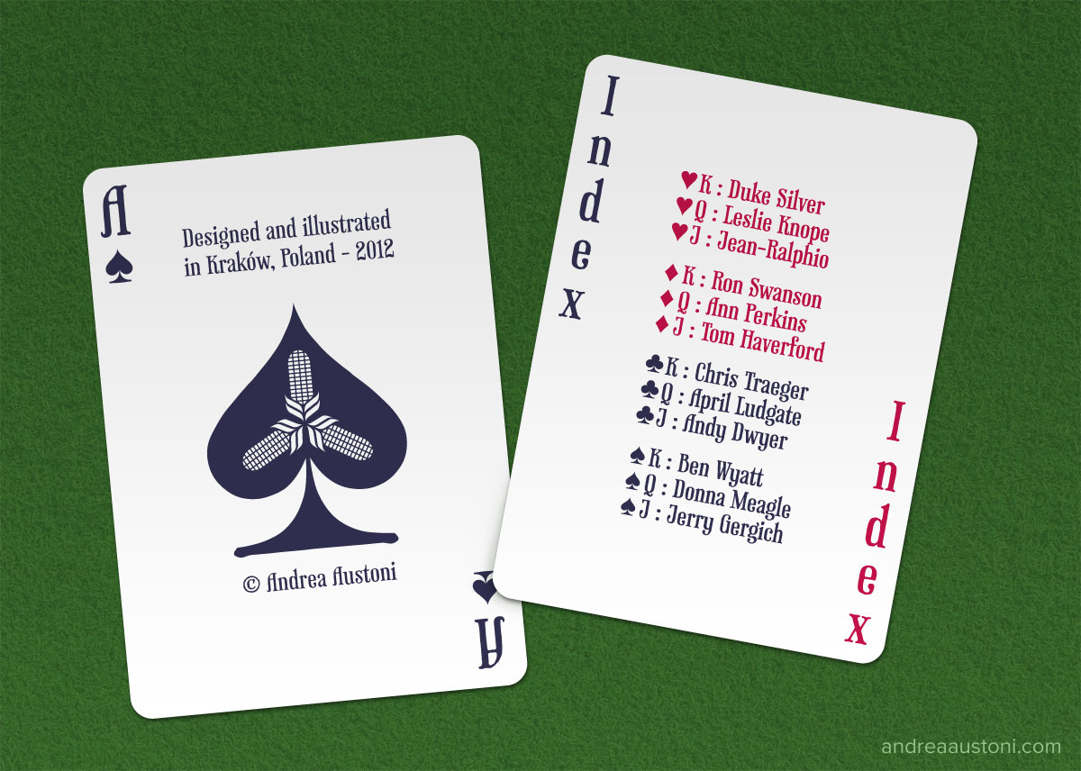 The back of the cards features a Parks and Recreation banner as well as a logo made out of three corncobs - a reference to the Harvest festival in Pawnee. The figure cards feature the characters, portrayed as cartoony caricatures. I tried to capture the characters' personalities and quirks. Assigning them to Kings, Jacks and Queens was very easy and the process of creating the likenesses was stressful but fun.