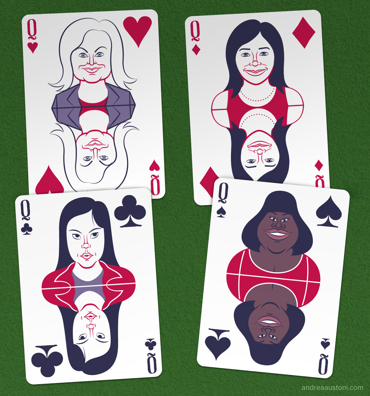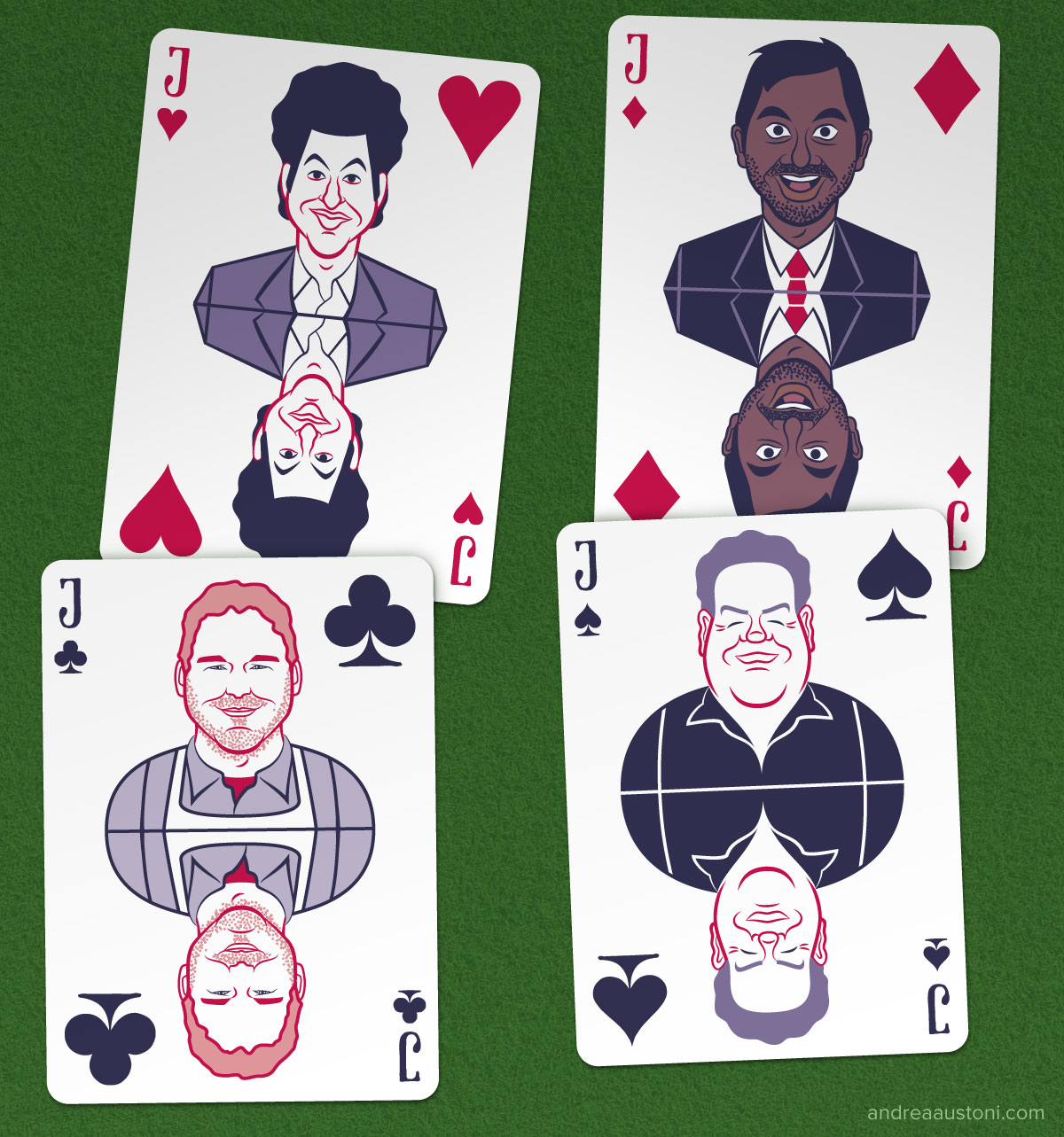 I watch a lot of TV shows and one day I noticed that Parks and Recreation has exactly 8 male and 4 female characters, making it the perfect subject for a deck of illustrated cards. So this was a personal project devised as a way to practice my illustration skills, do something different from my usual paintings and pay tribute to one of my favorite comedy shows.
