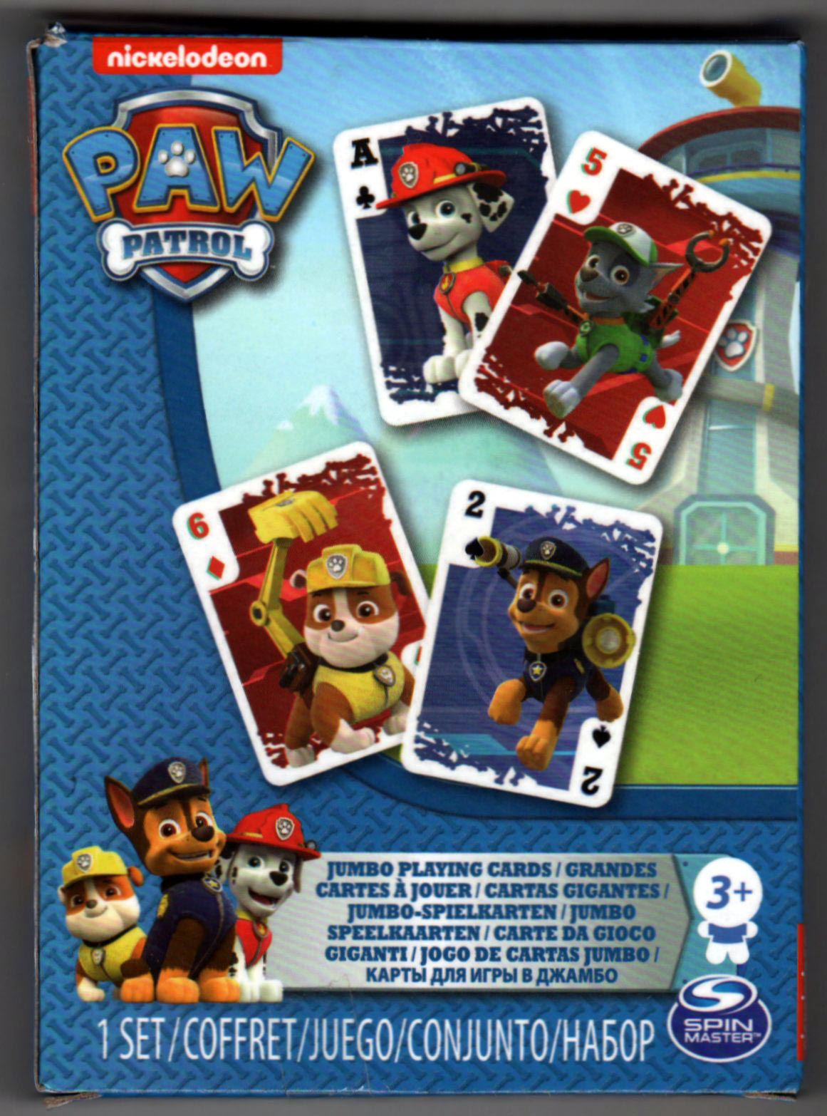 Paw Patrol is a children’s animated adventure series by satellite broadcast channel Nickelodeon, depicting a group of rescue dogs and a tech-savvy boy named Ryder. The associated playing cards are “jumbo” size (twice the size of ordinary playing cards). Each denomination of card features a different character from the show, with the same image repeated across the suits but with a red or black background depending on the suit.