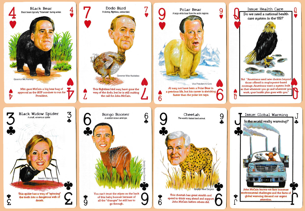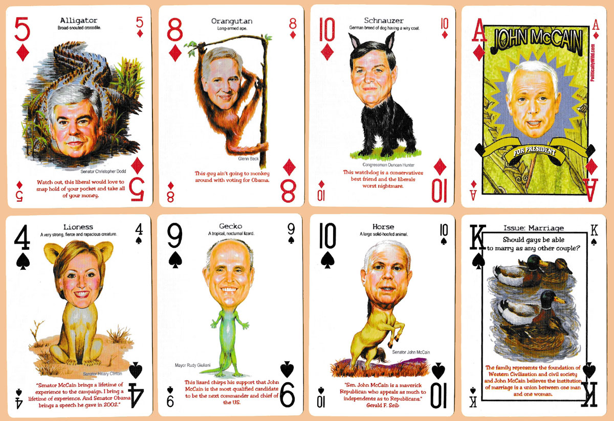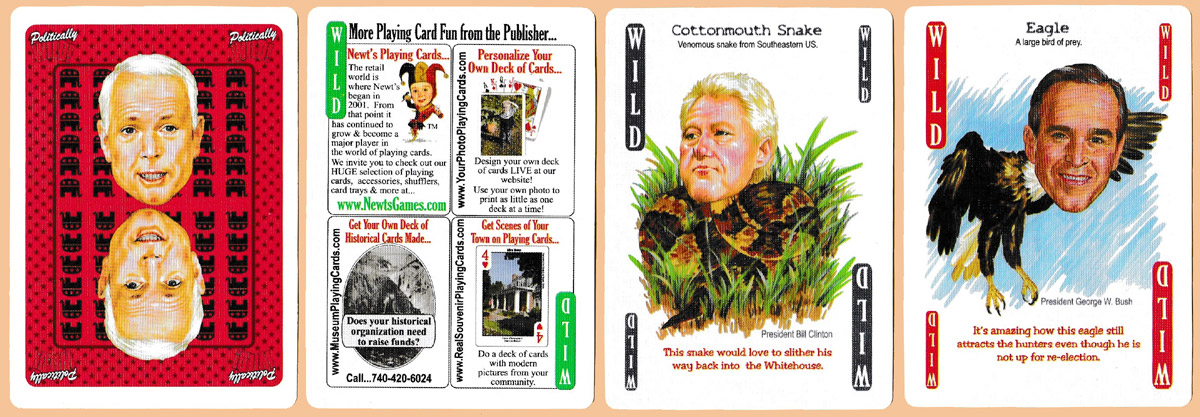 Published by Newt’s Playing Cards in 2008, the pip cards of this pack feature hilarious images of politicians, and political celebrities drawn as wild animals (with rationale or explanation beneath), while the court cards present current issues (such as gun control, health care, immigration, global warming, abortion, etc.) alongside McCain’s views on the topic. The two jokers (or “Wild” cards) are President G.W. Bush as an eagle, and President Bill Clinton as a cottonmouth snake.