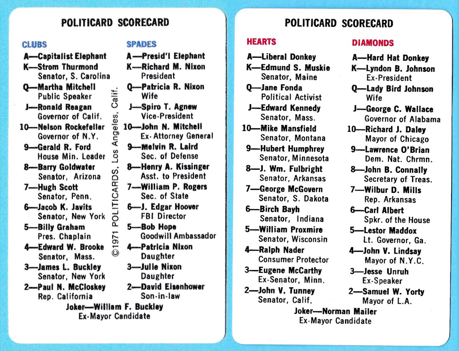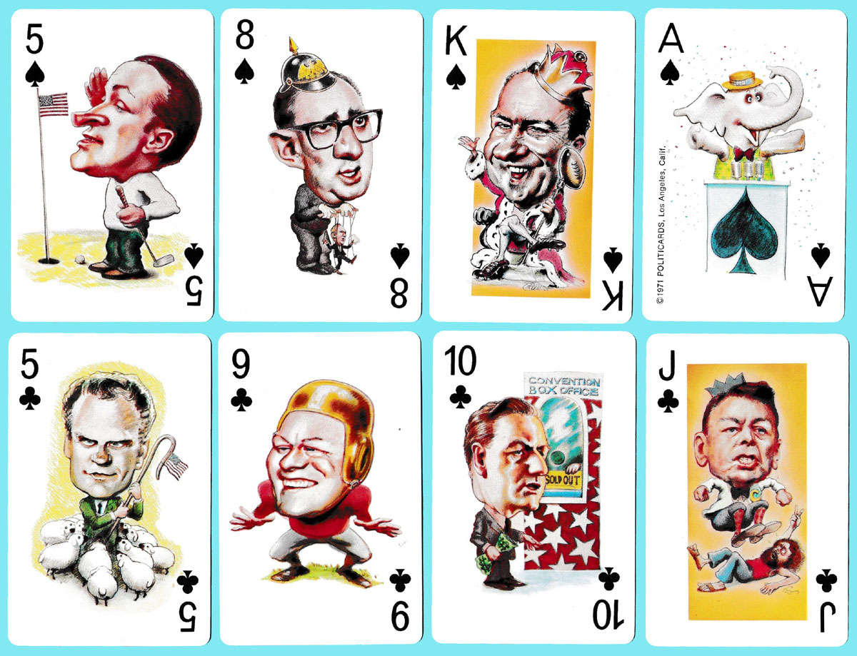 This was the first pack of Politicards to be produced. The pack was created in 1971 and released in 1972 in anticipation of that Fall's presidential election. This was the election in which incumbent Republican president Richard Nixon defeated Democratic U.S. senator George McGovern in an historic-level landslide. The cards were conceived and designed by the (then) 26-year-old designer and illustrator Peter Green. The cards humorously depict various politicians, candidates, wives of politicians, celebrities, and other familiar faces (such as Ronald Reagan, Richard Nixon, Henry Kissinger, J. Edgar Hoover, Bob Hope, and Jane Fonda). The 2 jokers are Norman Mailer and William F. Buckly. See the key card►