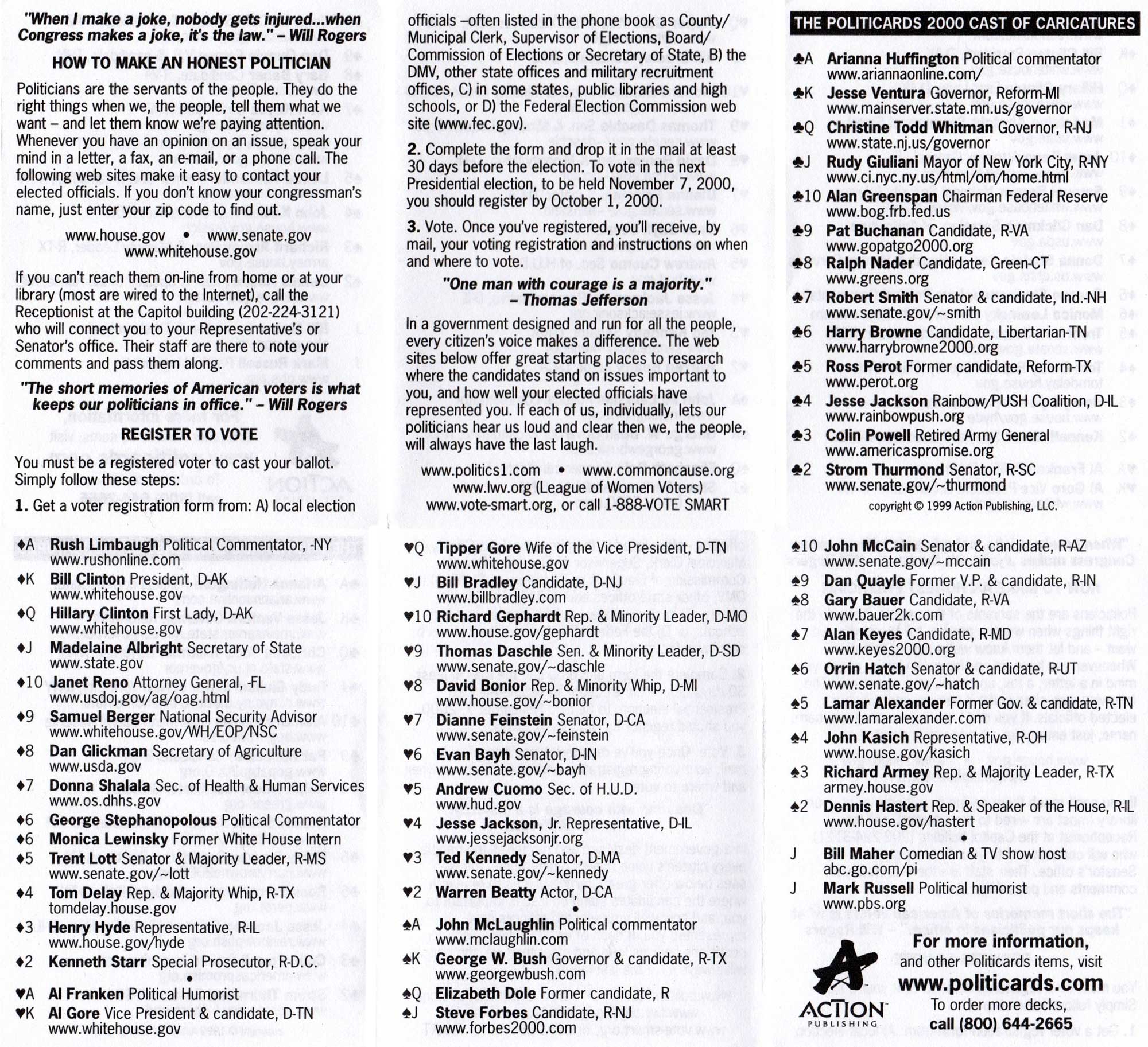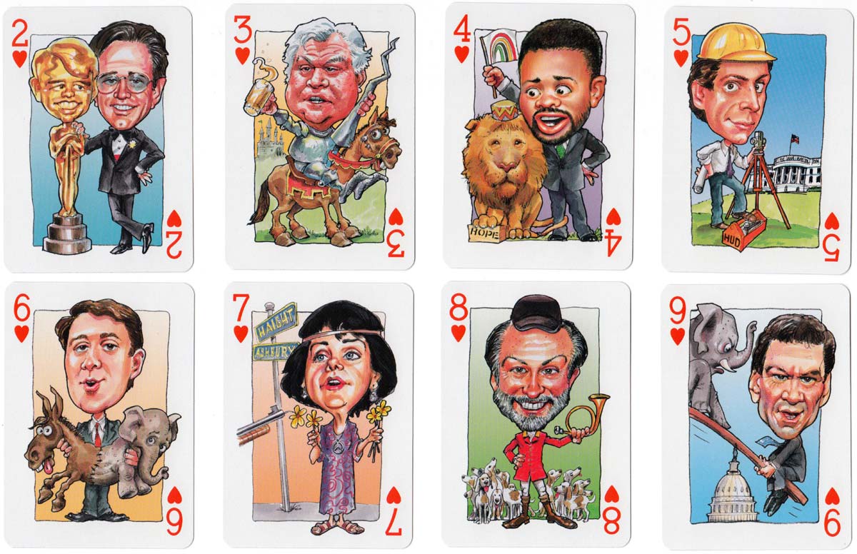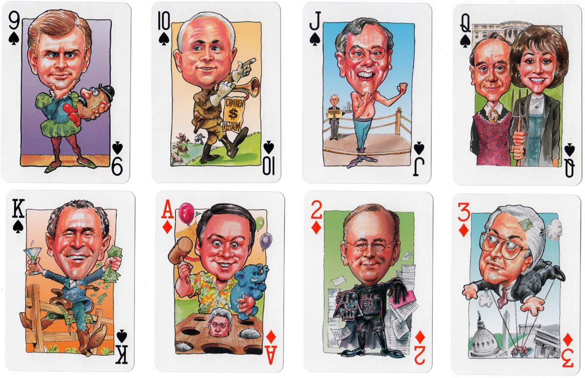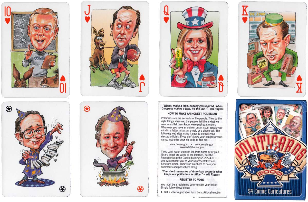 The caricatures are reproduced on a 54 card poker deck which is cello-wrapped with an index card and a folded paper insert (listing contact information for the politicians and a brief voter registration guide) and inserted into a 4-color tuck box which is again cello-wrapped.