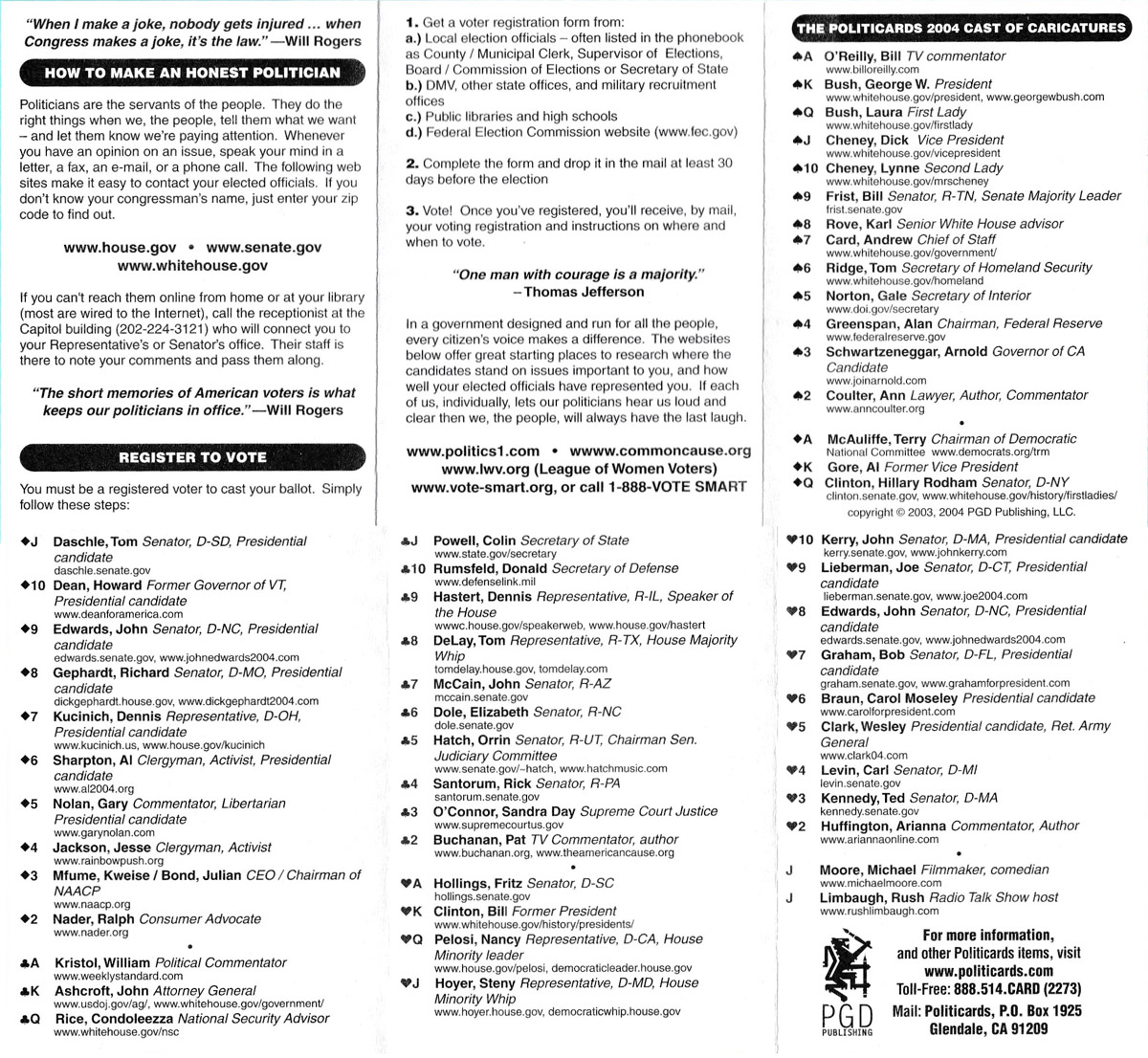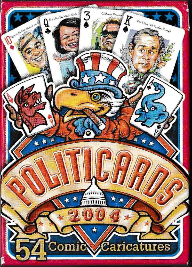 Like earlier issues in the Politicards series, this is a humorous who's who of presidential candidates and political players at the time of the 55th presidential election, held in November 2004, in which the Republican incumbent President George W. Bush and his running mate incumbent Vice President Dick Cheney were elected to a second term, defeating the Democratic ticket of John Kerry and his running mate John Edwards. The 54 cards offer further satirical cartoons by the award-winning illustrator Peter Green. In addition to the 54 cards there is an extra card listing the cards on which the characters are displayed, and a folded paper insert (listing contact information for the politicians and a brief voter registration guide). See the extra card►