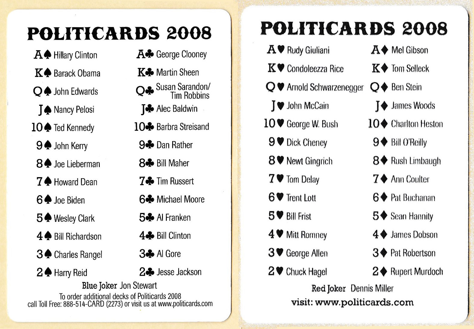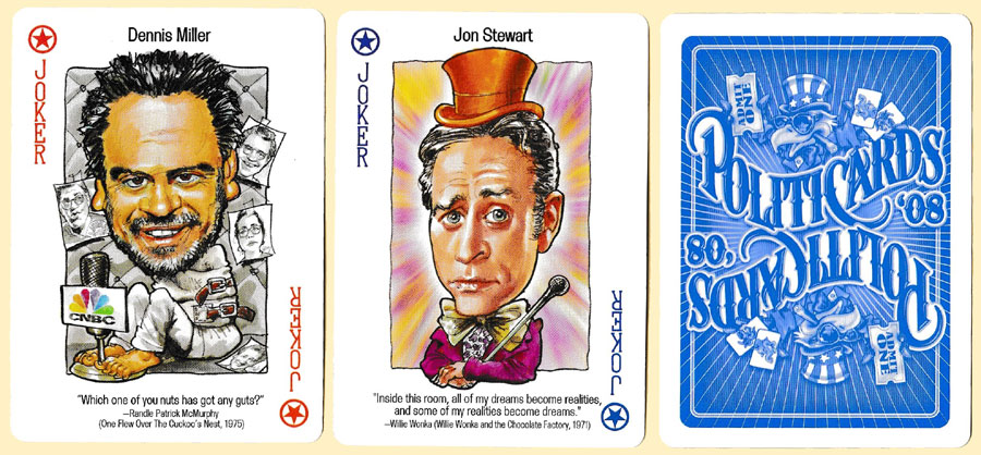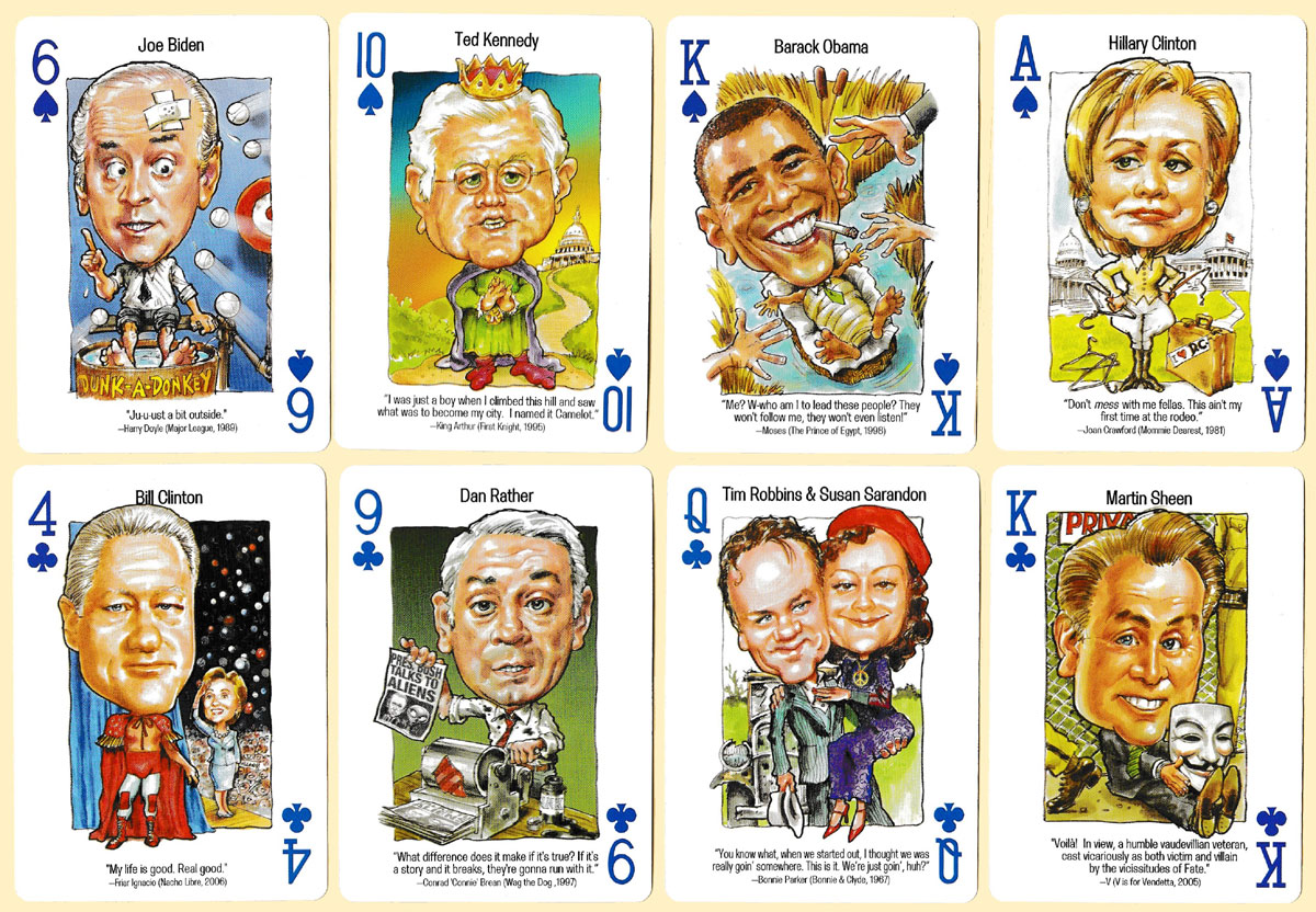 In this pack Peter Green has once again produced comic caricatures of the leading politicians, media pundits and celebrities of 2008 – the year in which the Democratic ticket of Barack Obama and Joe Biden defeated the Republican ticket of John McCain and Sarah Palin. However, there is a slight twist this year: in recognition of Ronald Reagan's remark that "Politics is just like show business" the individuals are cast as characters from classic feature films. So, for example, Joe Liberman is a “Rebel without a cause”, John Kerry is King Arthur from “Monty Python and the Holy Grail”, and Barack Obama is Moses from the film “The Prince of Egypt”. Beneath each figure is a line from their respective film. Although the names of the individuals are given on each card, there is an extra card which lists them by suit.