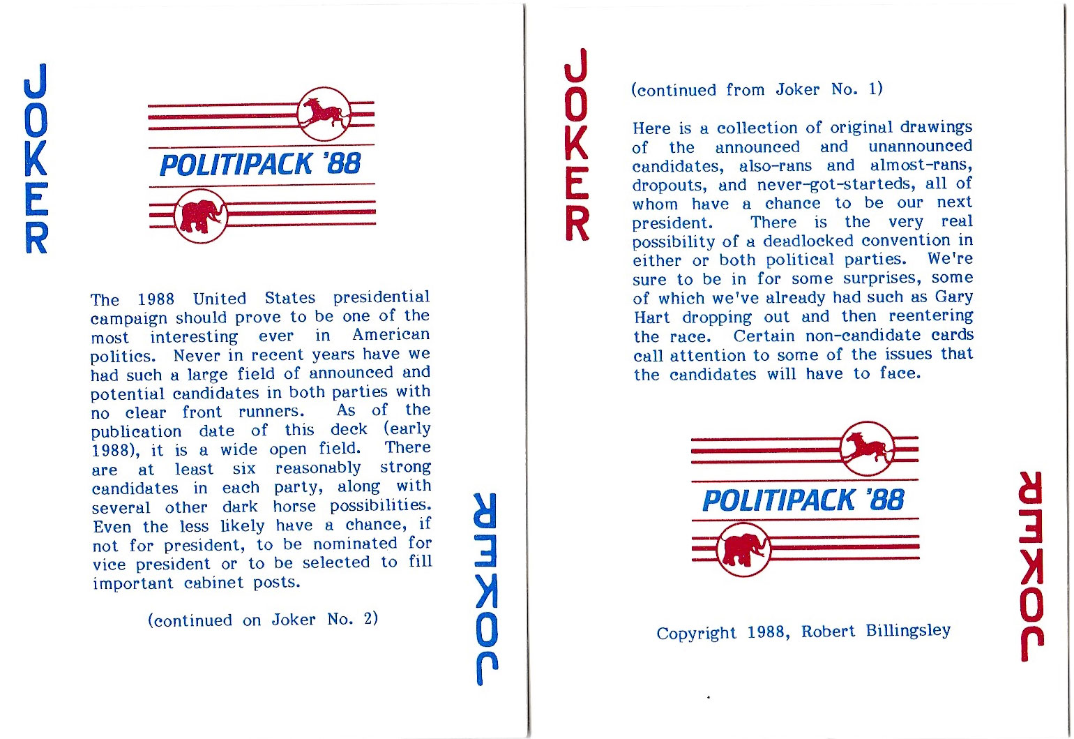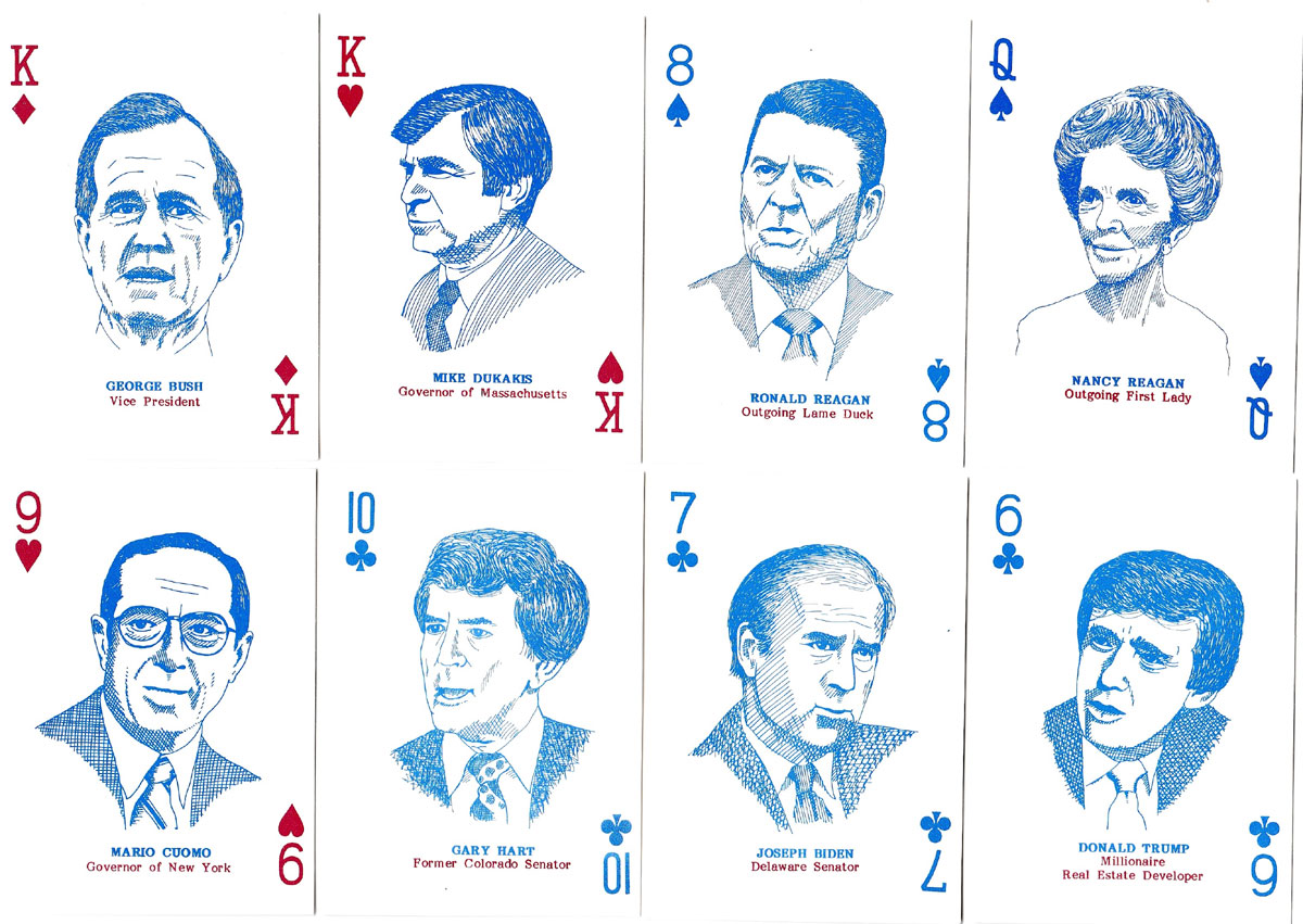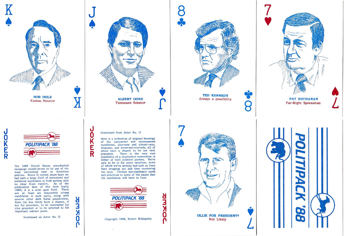 Produced by R. Billingsley in early 1988 (c.1987) in advance of the November 1988 US Presidential election, this pack offers a collection of “original drawings of the announced and unannounced candidates, also-rans and almost-rans, dropouts, and never-got-started, all of whom have a chance to be our next President” (see more). In addition to the drawings some of the cards call attention to some of the issues that the candidates will have to face. In the event George H.W. Bush, with running mate Dan Quayle (Republican) defeated Democrat rivals Michael Dukakis and Lloyd Bentsen.
