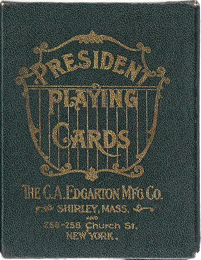 An historic American advertising deck for the C. A. Edgarton Mfg Company, manufacturers of the President Suspender (known as “braces” in England) depicting 16 U.S. Presidents on the Kings and Jacks and First Ladies on the Queens. Advertising appears on the backs, Ace of Spades, Joker, court cards and box. The deck also has an obvious patriotic message.