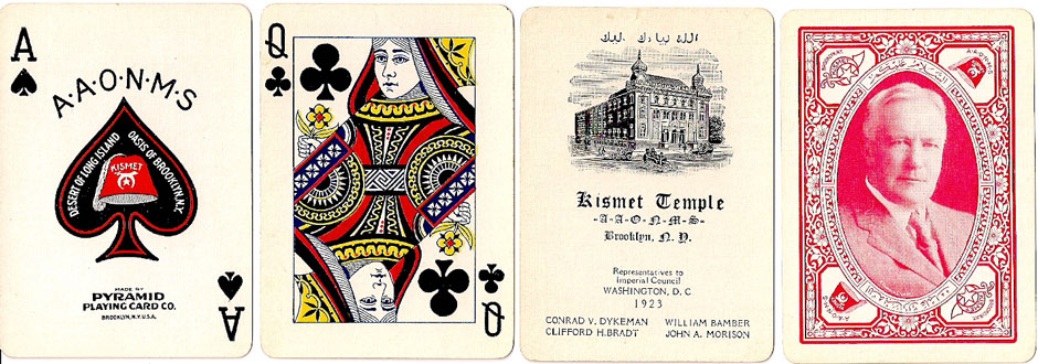 The deck was made to honour Conrad V. Dykeman as Imperial Potentate of the Kismet Temple of the Ancient Arab Order of the Nobles of the Mystic Shrine, a spin off of the Free and Accepted Masons.
