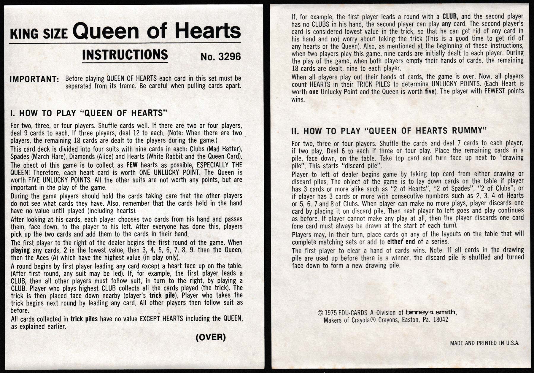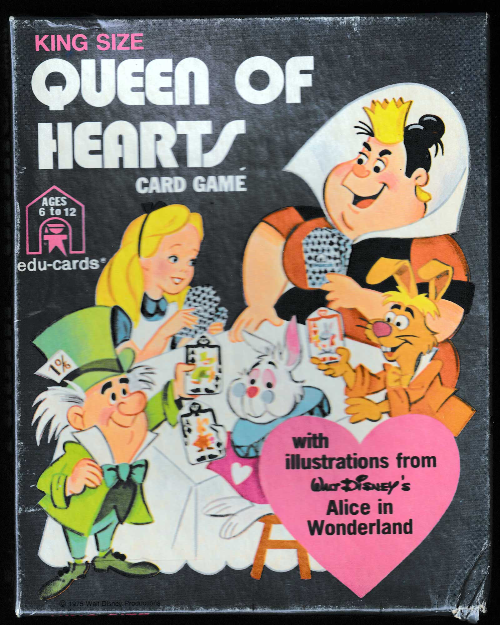 Above: King size Queen of Hearts card game published by EDU-CARDS, a Division of Binney & Smith, Easton, PA, USA, 1975. Made and printed in USA. 36 cards + instructions in drop-lid box. Size: 81 x 135 mm approx. © 1975 EDU-CARDS A Division of Binney & Smith. © Walt Disney Productions