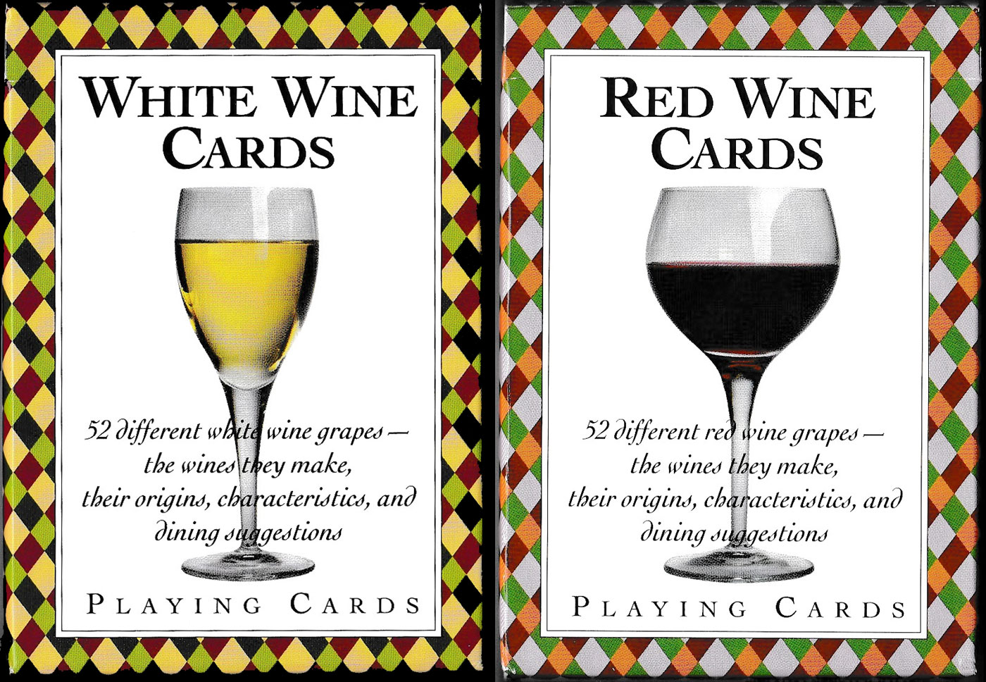 A matching pair of packs, published in 2003 by Inkstone Design Inc. of Missoula, Montana, describing different red or white wine grapes on the 52 cards in each pack. In addition, information is provided about the wines they make, their origins, characteristics and dining suggestions. While many of these grape varieties will be familiar, there are many others (such as Aglianico, Teroldego, Cinsaut, etc.) which may be new to casual wine drinkers. There are 2 additional jokers and a publisher’s promotional card in each pack. See the boxes►