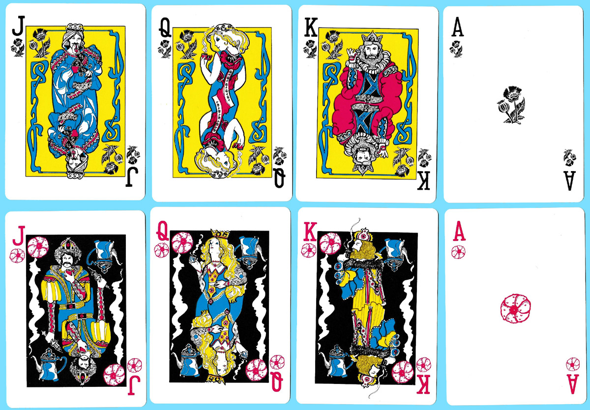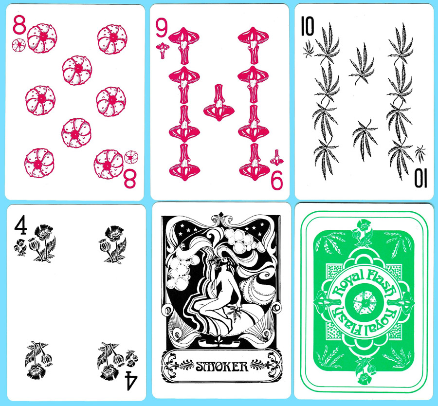 In this drug-promoting pack published in 1974 by DuRite Enterprises, the standard suits have been replaced by non-standard symbols representing plants used in the making of marijuana and other drugs: cannabis leaf, peyote cactus, opium poppy and magic mushrooms – with each of these suits shown against a different coloured background.