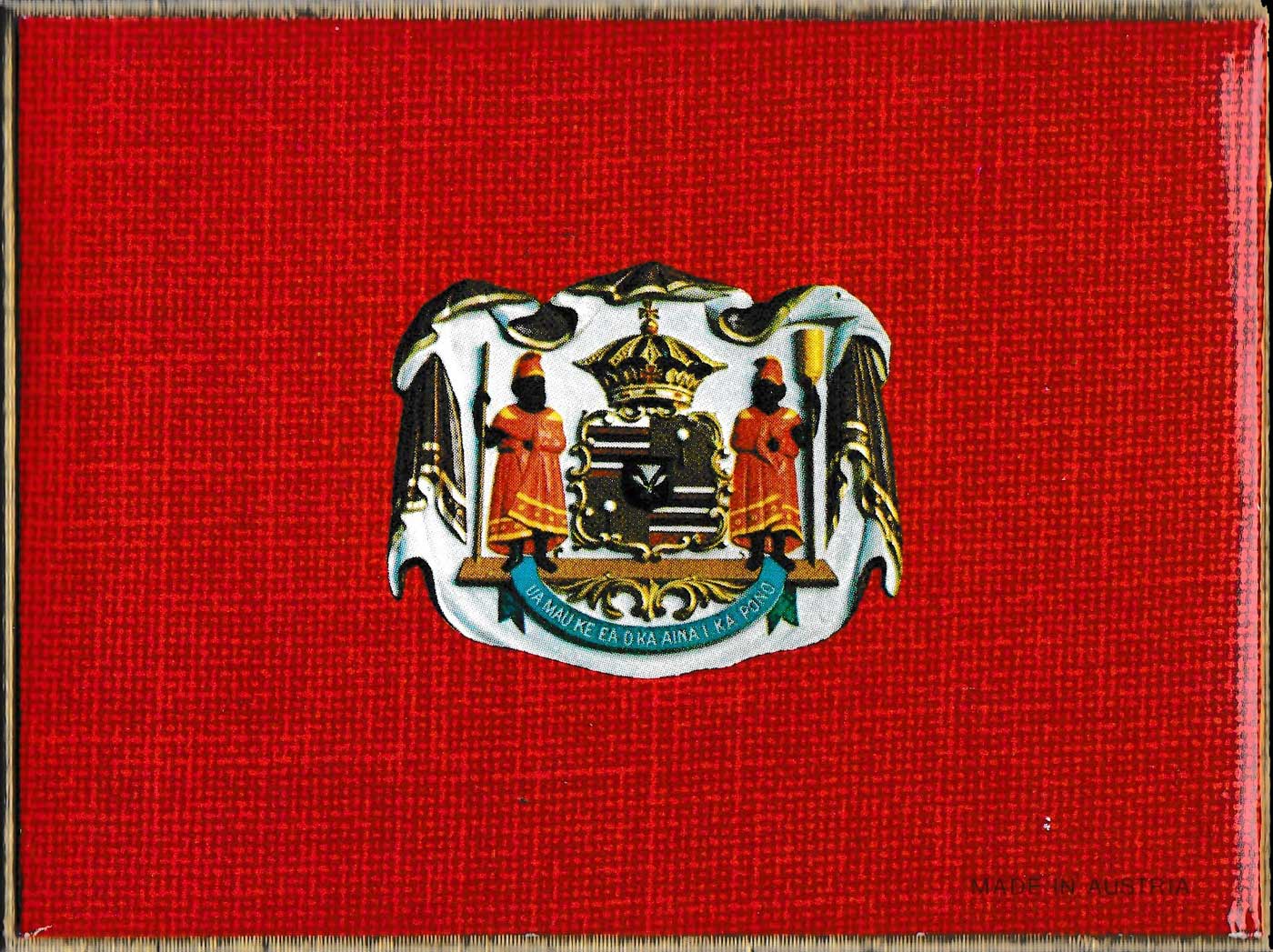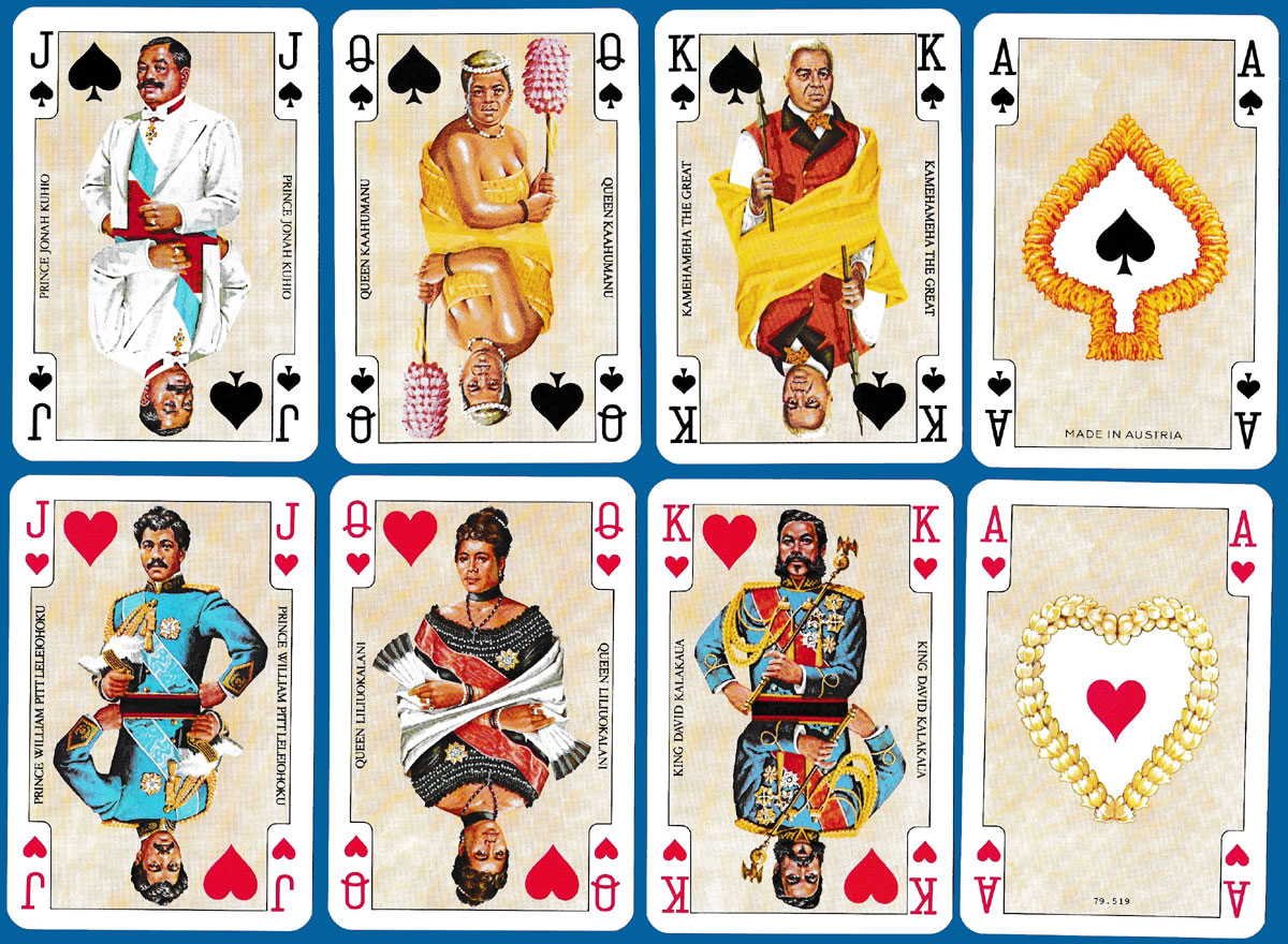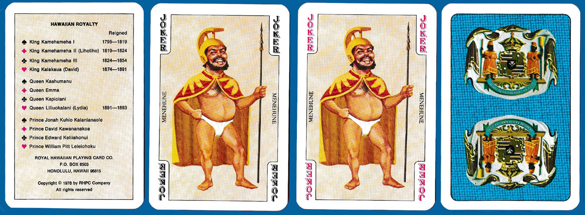 Published as a boxed double pack by the Royal Hawaiian Playing Card Company, Honolulu, in 1978, the conventional court cards are replaced with magnificent portraits of Hawaiian royalty, who existed during the period 1795, when King Kamehameha I was proclaimed king until 1893 when Queen Liliuokalani was dethroned. The joker is the Menehune – old Hawaii’s legendary, fun-loving “little folk”, and the card backs bear the coat-of-arms of the Hawaiian Kingdom. An extra card details the individual kings, queens and princes on the court cards, and an explanatory booklet provides brief biographies of the royalty shown. See the booklet►