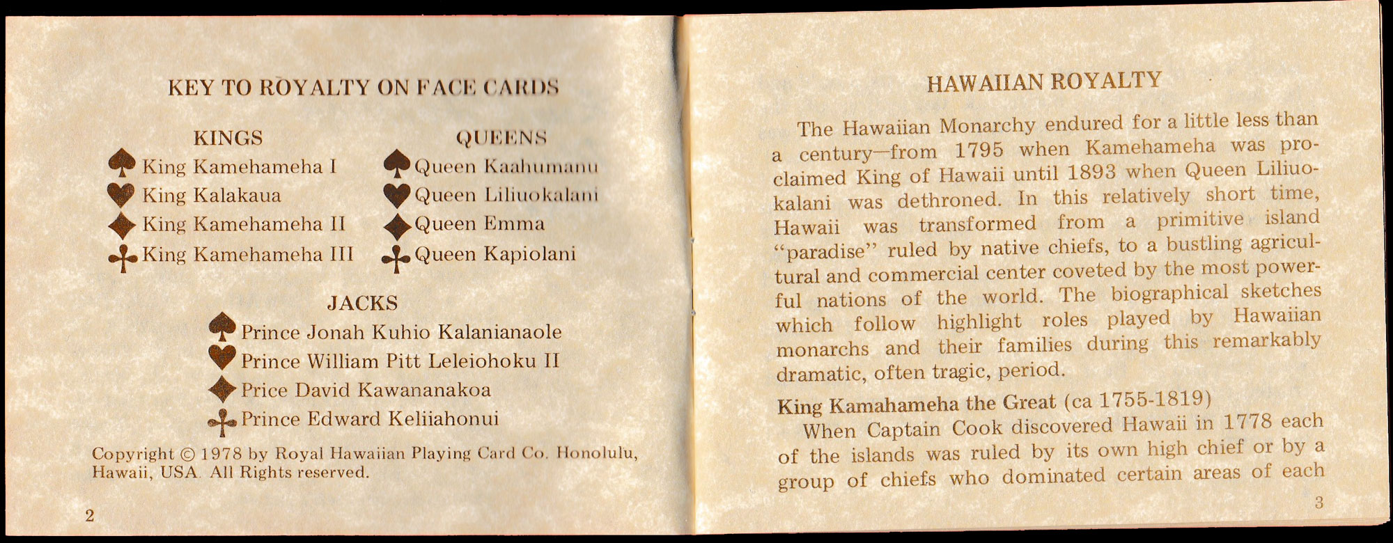 Above: Royal Hawaiian playing cards published by the Royal Hawaiian Playing Card Company, Honolulu, in 1978.