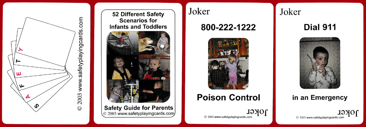 This pack is intended as a safety guide for parents to help them care for the wellbeing of their infants and toddlers by describing 52 potential safety hazards (e.g. plastic, electrical cords, unstable furniture, work tools, etc.) and offering advice on how to prevent or eliminate them. The two jokers provide telephone numbers in case of emergencies, including poisoning, and an extra card acts as the title page. The pack was published in 2003 by www.safetyplayingcards.com►