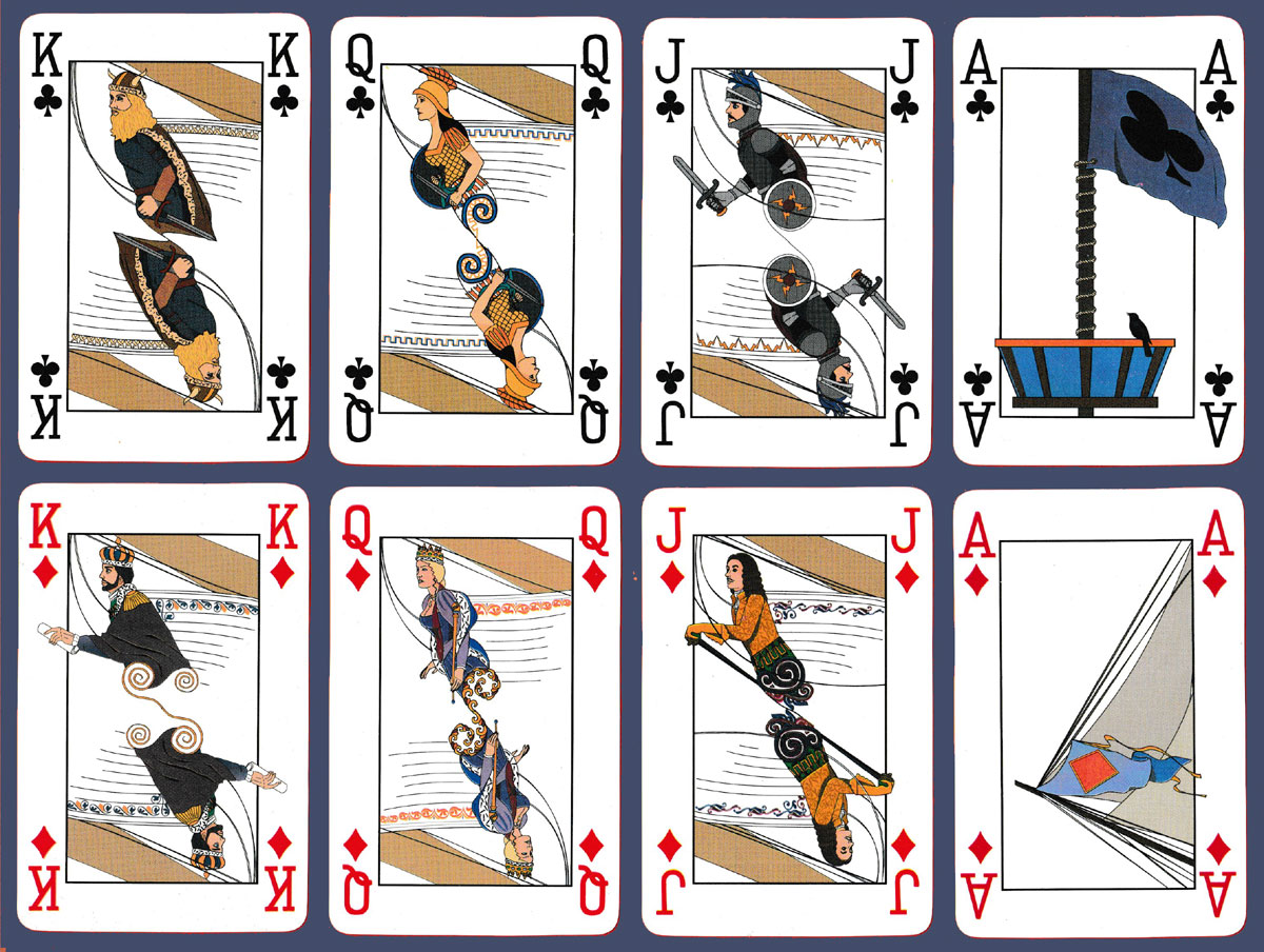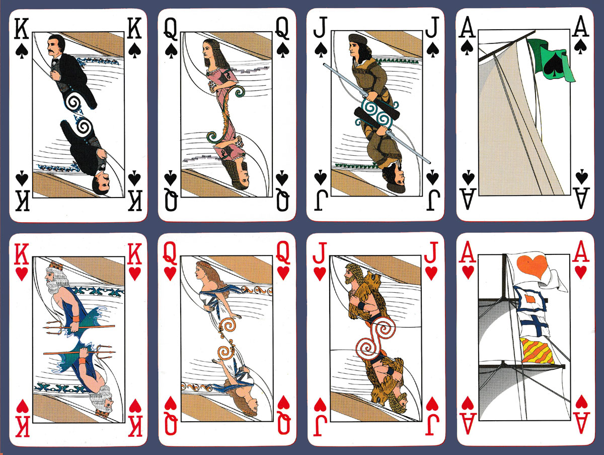 Figureheads are a carved representation of the name or the spirit of the ship in question, in the form of people, beasts or mythological figures. Twelve of them, illustrated by C. Munford, are depicted on the court cards in this all-plastic pack. A different style or period has been adopted for each suit, e.g., mythological (H), 19th century North American (S). On the aces are masts and signal flags including a crow’s nest on the Ace of Clubs. One of the Jokers features a booted, skeletal figure, while a pirate inspecting a chest full of hardware can be found on the other. The same pirate appears on the reverse as part of a detailed and colourful back design with a view of a ship’s quarter gallery.