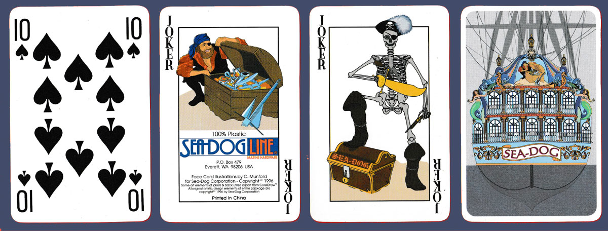 Above: Sea-Dog playing cards illustrated by C. Munford, published by Sea-Dog Corporation, Everett, WA, USA, 1996. 52 cards + 2 Jokers in clear plastic box. Size: 58 x 89.5 mm. Printed in China.