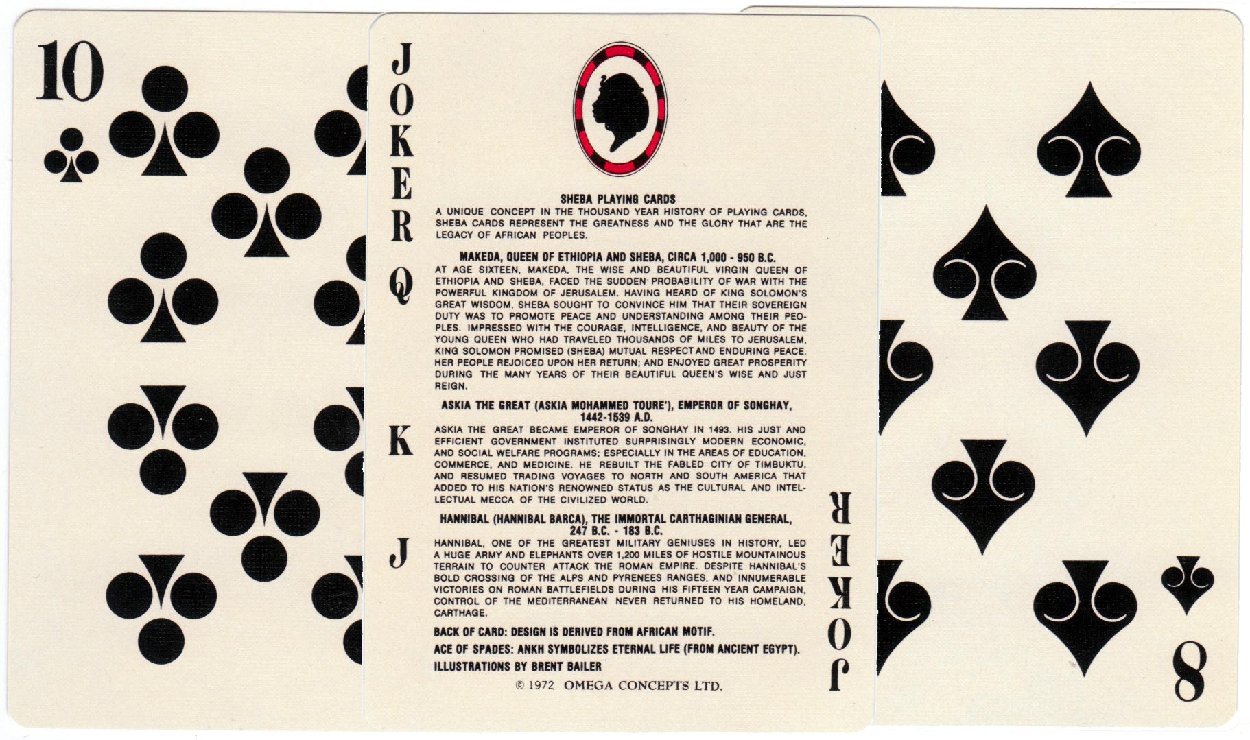 Sheba playing cards illustrated by Brent Bailer and published by Omega Concepts Ltd, 1972, reflect the great legacy of African peoples. Hannibal is depicted on the four Jacks, whilst the ace of spades features an Ankh, symbol of eternal life. More details are provided on the extra card which accompanies the deck. See the Box►