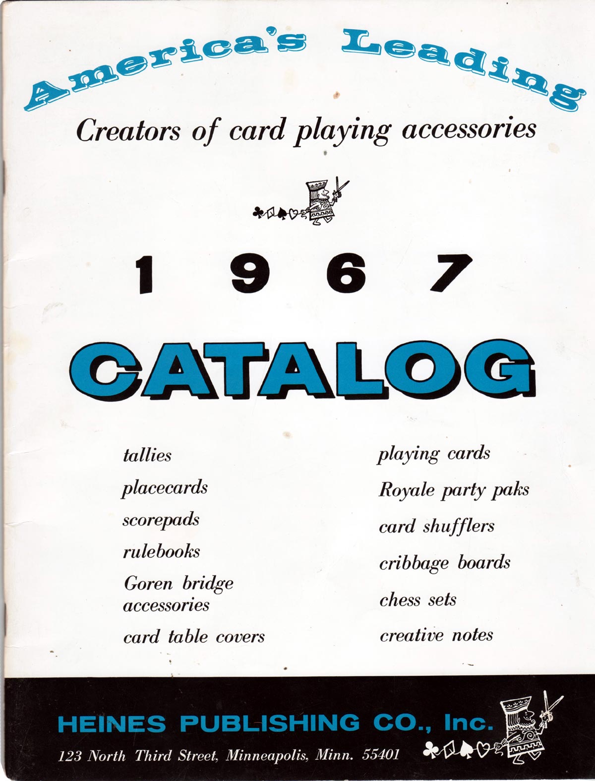At some point in the 1960s, Heines House and Charles H Goren’s Trend Development Corporation merged their publishing interests. Heines House became a component division of the new TDC Inc., with a new castle silhouette logo. The new business brought together the publishing interests of Heines Publishing Company and TDC’s Goren range of playing-card accessories gambling chips, cribbage boards and the Goren Bridge playing cards. It is not known exactly when the merger took place but production of ‘Royale’ playing-cards continued as a Heines brand of the TDC Inc., although card production was still contracted out to USPCC, the ace of spades was customized to the ‘Royale’ brand and gives Heines House as publisher while the box states that Heines House is a TDC company. The use of MINN as an abbreviation for Minnesota provides some circumstantial evidence that the merger took place before 1963 when the US Postal Service introduced two letter abbreviations for American States but this is by no means definitive. The Head Office was in Minneapolis and orders for all of Goren/Heines products were received there and sent to Amery, WI, where production took place. The Heines ‘happy king with a wand’ logo was incorporated into a new TDC-Heines logo. In 1975, many of Goren’s books were reprinted under the TDCHeines imprint at Amery.