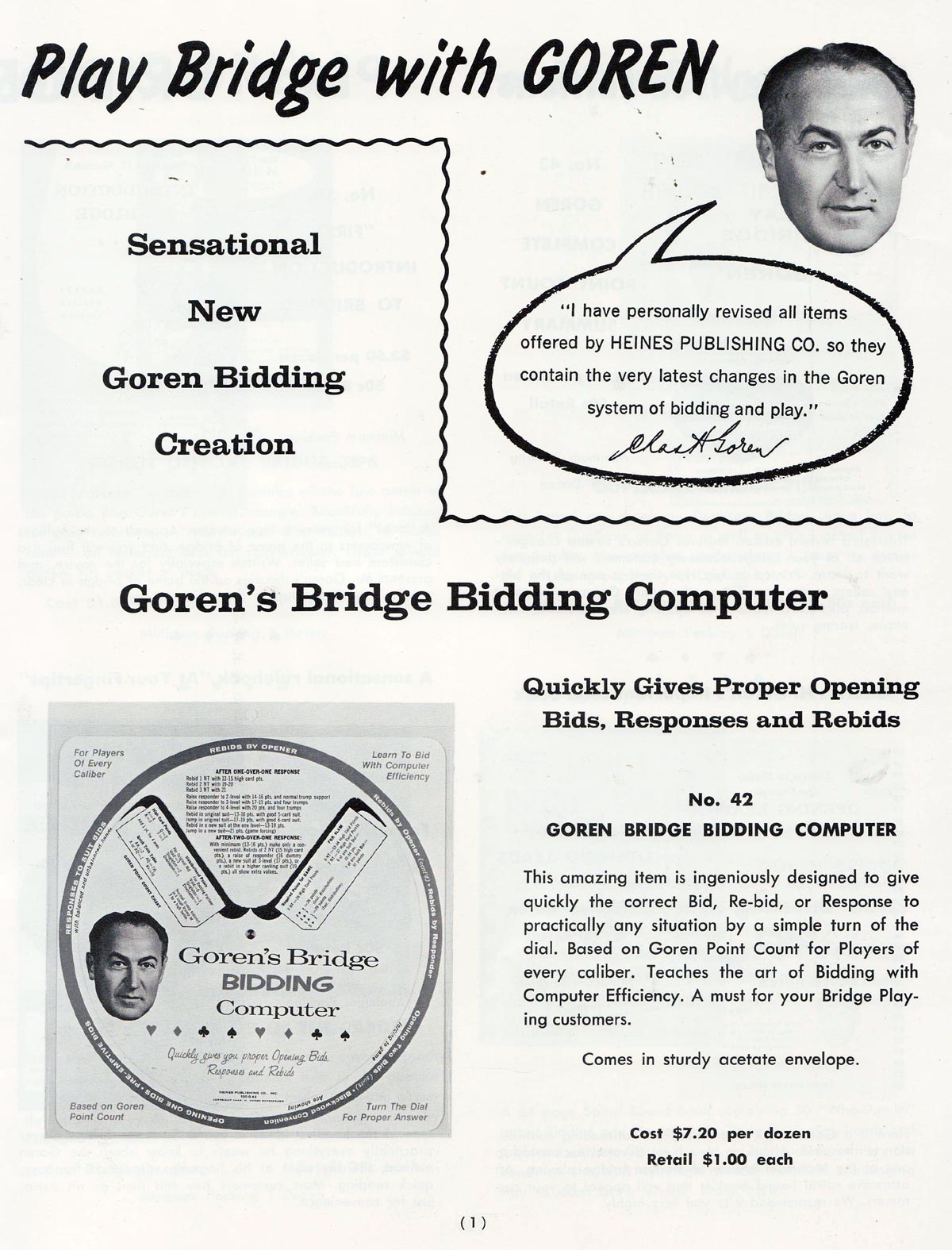 Heines Publishing Co. and Charles Goren enjoyed a profitable business relationship for many years dating from 1954 when ‘An Entirely New Bridge Summary’ and ‘Duplicate Bridge Tips’ were published by Heines Publishing Company with the copyright assigned to H Goren Enterprises Inc. Goren’s books and pamphlets featured in Heines’ catalogues of playing card accessories but Goren’s more substantial hard-back works were published by established international publishers of hard-back books. Charles Goren died in 1991 aged 90.