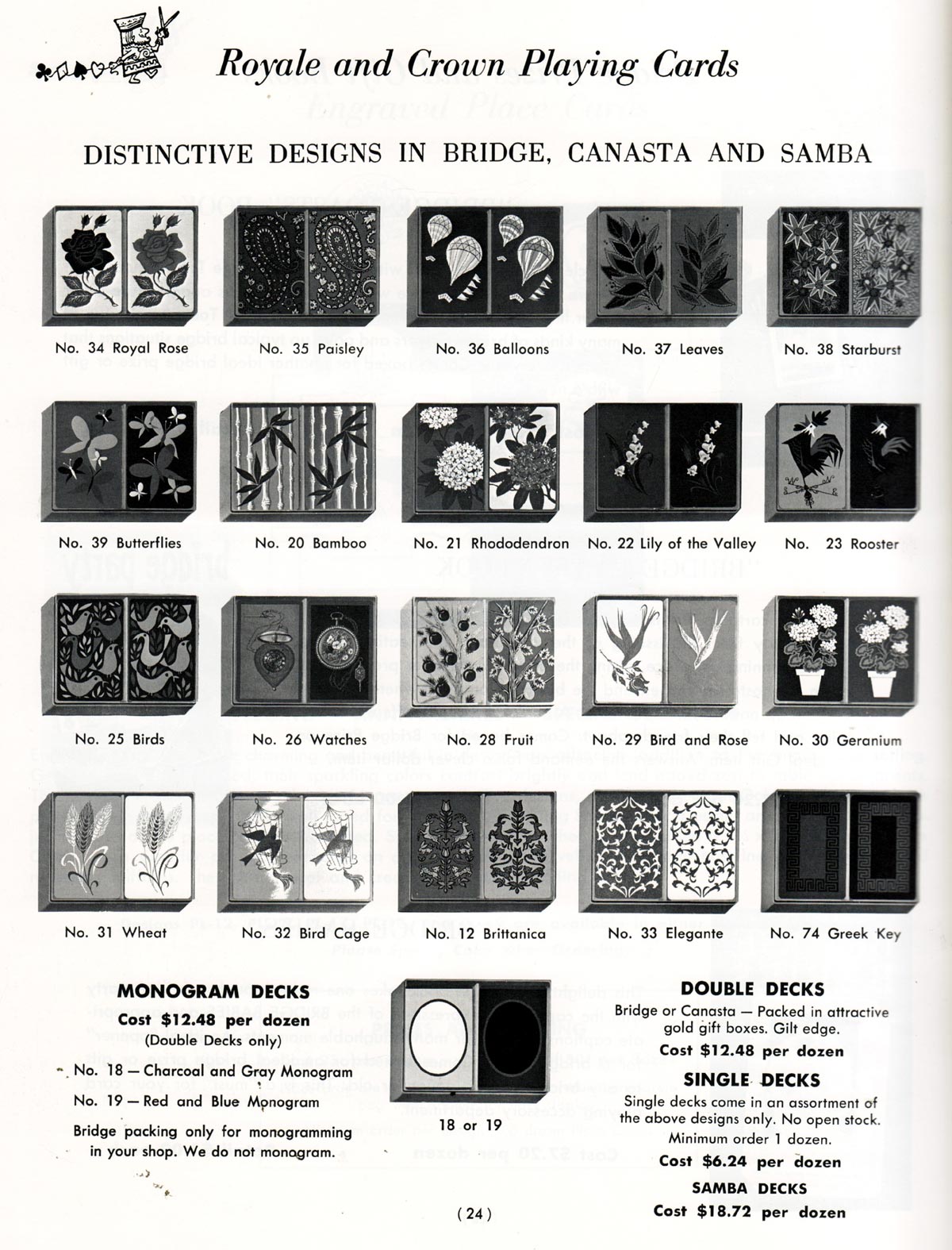 Booklets were produced at a plant in Amery Wisconsin but the playing-card decks were either made by Arrco of Chicago or United States Playing Card Company of Cincinnati, published and marketed by Heines under the ‘Crown’ and ‘Royale’ brand names. They were often sold as double packs suitable for playing Bridge.