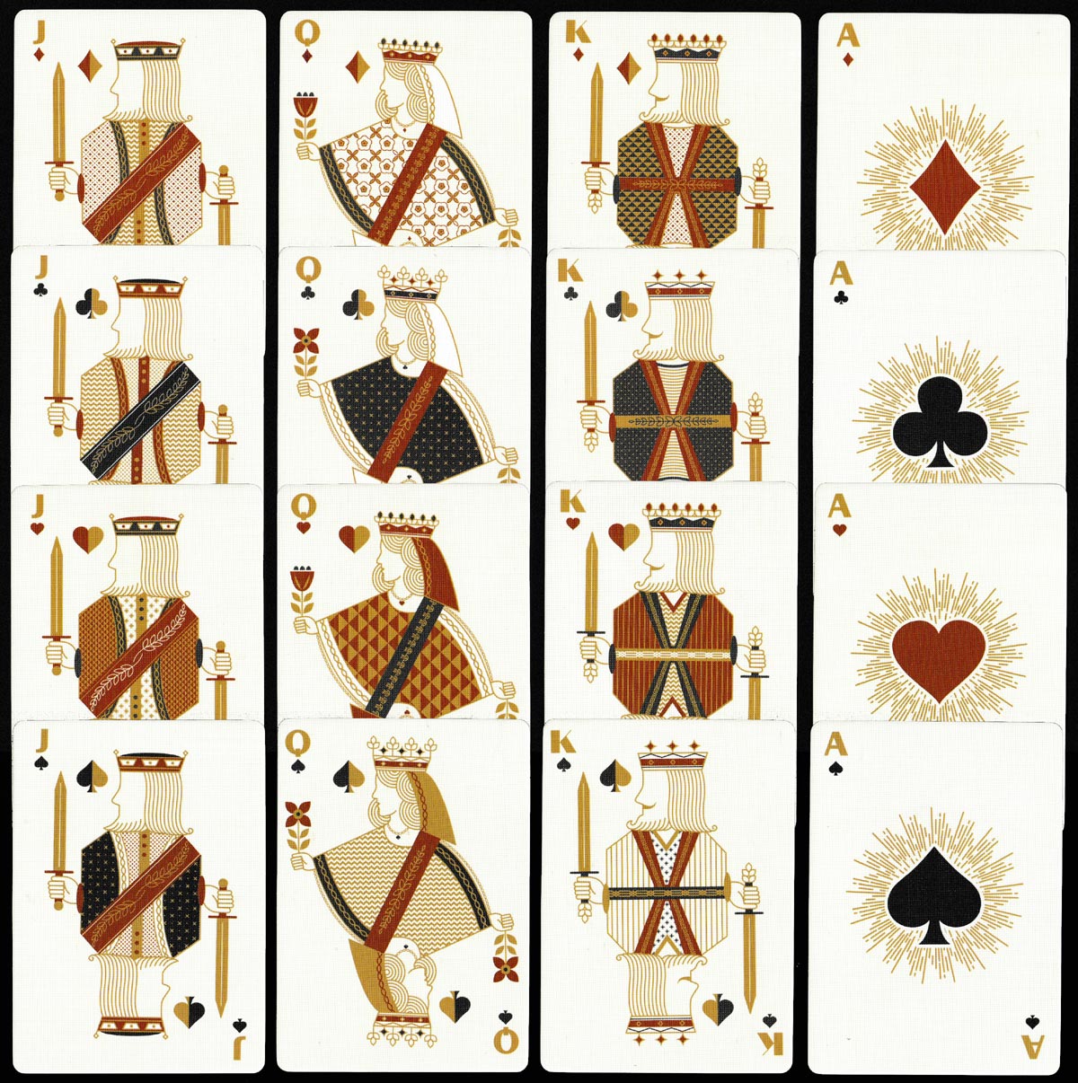 If you saw a pack called “The Great Indoors”, featuring pot plants all over the box, what would you expect to find inside? Tips about indoor gardening? Images of pot plants? Well, pot plants make up the pattern on the reverse, but the faces are quite a surprise. They have some traditional elements but the palette of colours used is unusual – maroon, pale gold, grey, etc. The same featureless faces have been used for all the court cards but there are subtle differences between the red suits and the black suits including different crowns, and different flowers held by the queens. The costumes are differently patterned and coloured. All the pips are bicoloured (split down the middle).