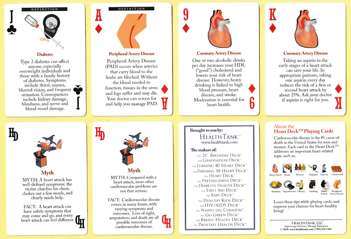 Learning while playing cards is nothing new: as long ago as the 17th century, Cardinal Mazarin was devising card games for the young Louis XIV so that he might learn about history and mythology while playing. In this set the subject matter is heart health, with different cards giving advice about stroke, heart failure, women, nutrition, exercise, smoking, obesity, cholesterol, hypertension, diabetes, peripheral artery disease and coronary artery disease. The Jokers are marked “HD”, standing for “Heart Deck”.
