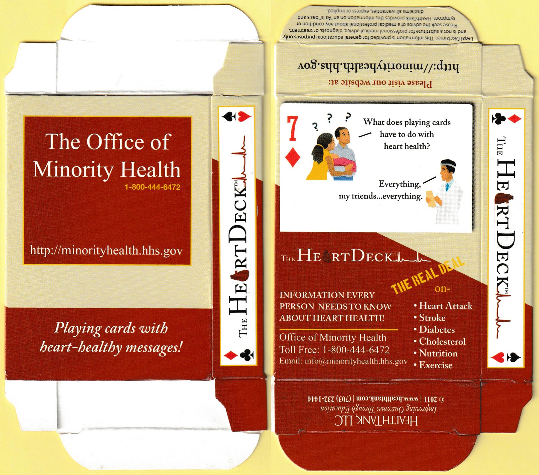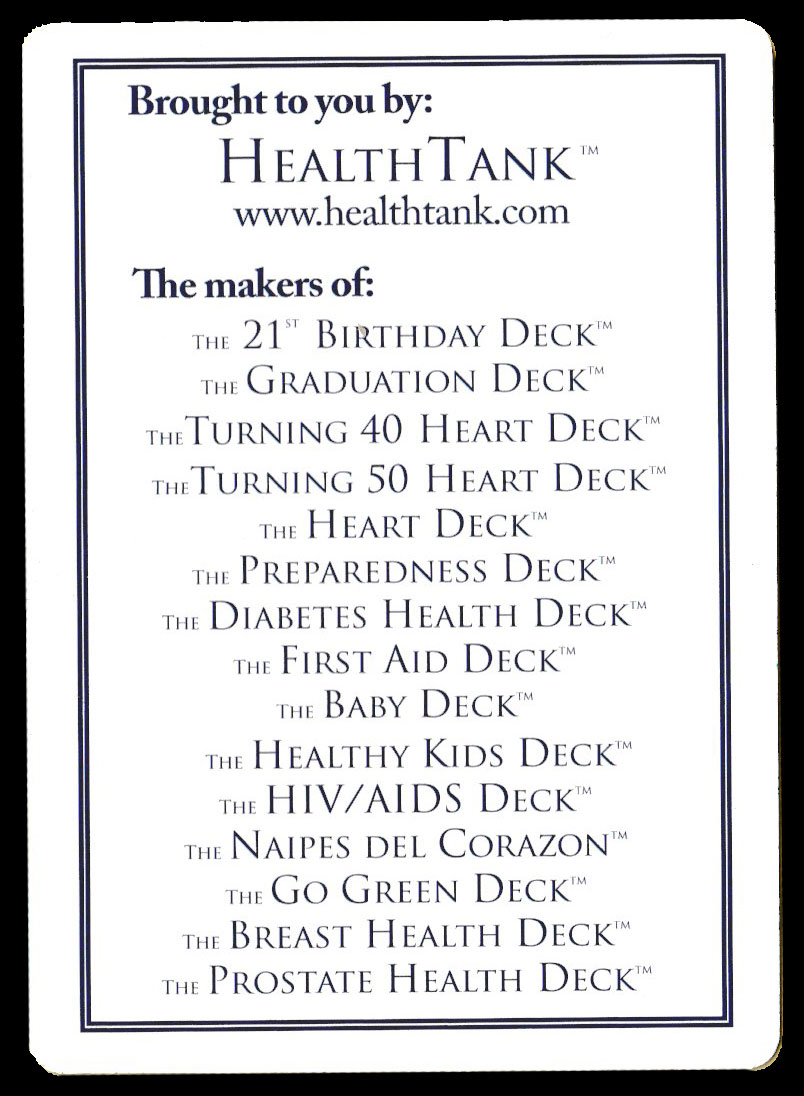 Above: The Heart Deck™ published by HealthTank, LLC, Virginia, U.S.A., 2011. Printer unknown. 52 cards + 2 Jokers (marked “HD”) + 2 extra cards in tuck box. Size: 64 x 89 mm.