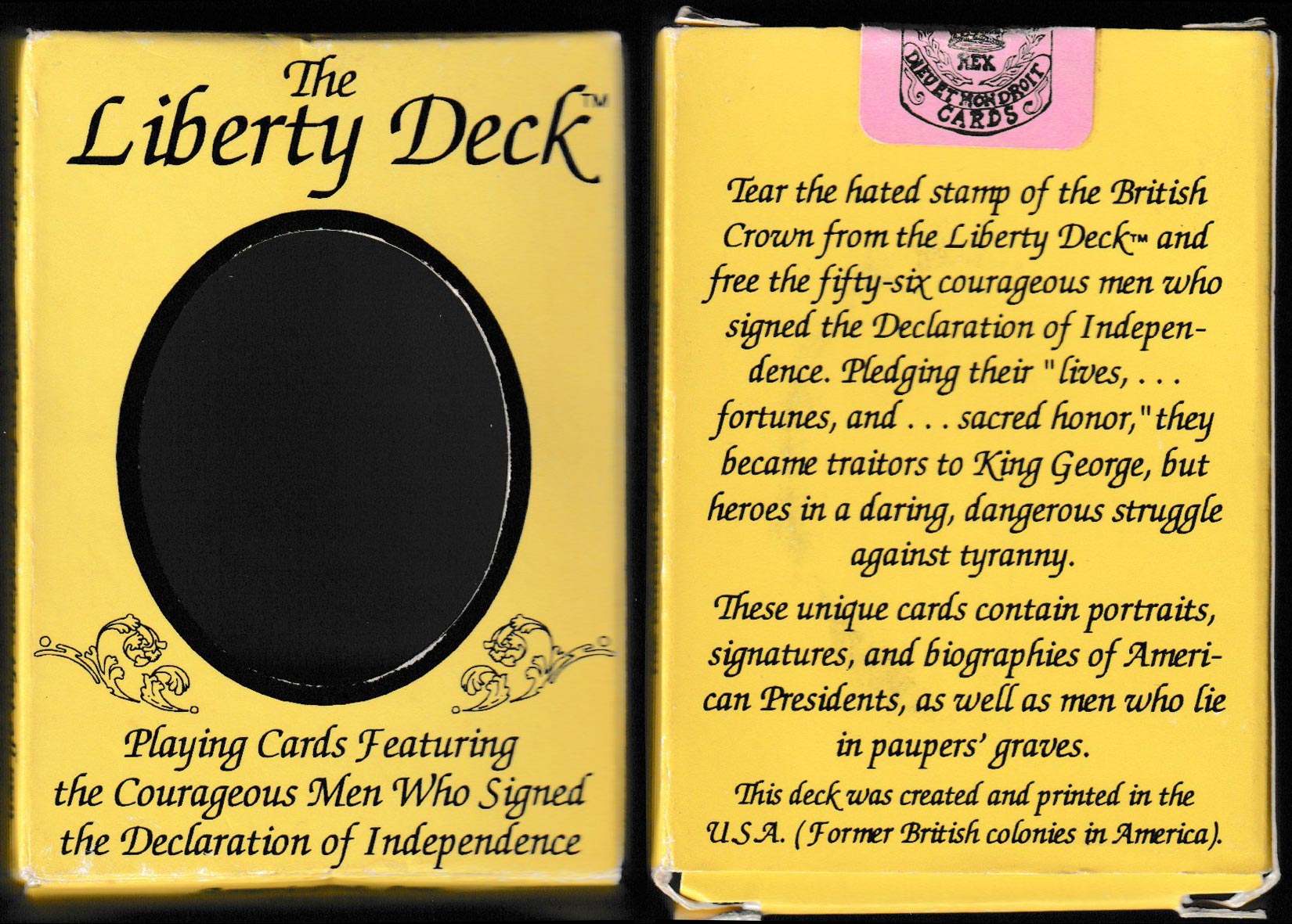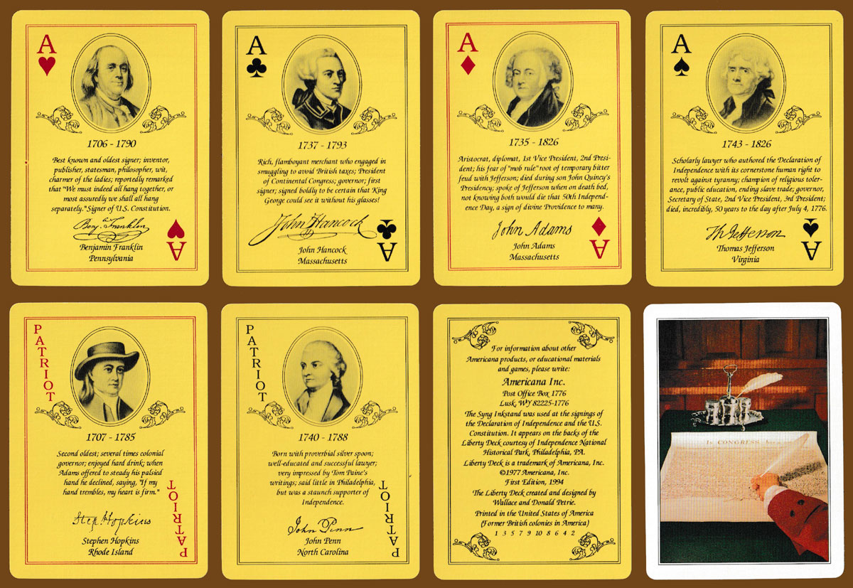 Above: The Liberty Deck created and designed by Wallace and Donald Petrie. Published by Americana, Inc., Lusk, Wyoming, USA, 1994. Printed in the USA. 52 cards + 4 ‘Patriot’ cards + 1 extra card in tuck box. Size: 63.5 x 88 mm.
