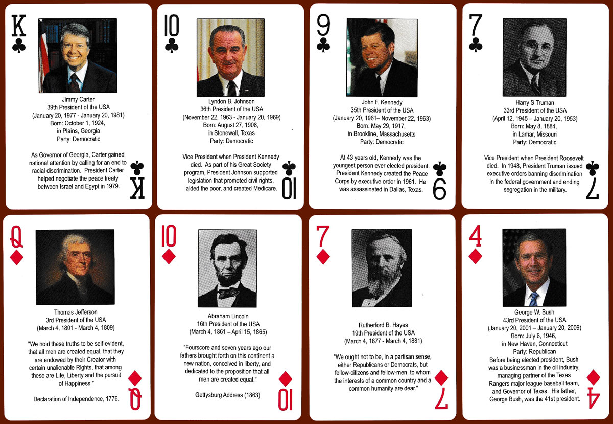‘Presidents of the United States’ playing cards published by PostCardusa of Florida after 2009.