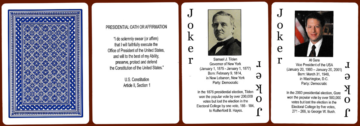 This pack was first published by Arcturus LLC in 2007, but was reprinted in 2009 to accommodate inclusion of Barack Obama, the 44th US president (2009-2017). A photograph of each president is shown on each card, below which are interesting facts and memorable quotes. As there were only 44 Presidents at the time of publication, some Presidents appear on several cards (but with different quotes). The two jokers are Samuel J. Tilden and Al Gore – two Presidential candidates who won the popular vote by several hundred thousand votes but lost subsequently in the Electoral College. There are two extra cards: the first detailing image credits for the photos; the second displaying the Presidential Oath or Affirmation. See the box►