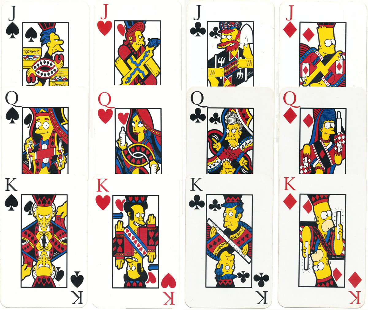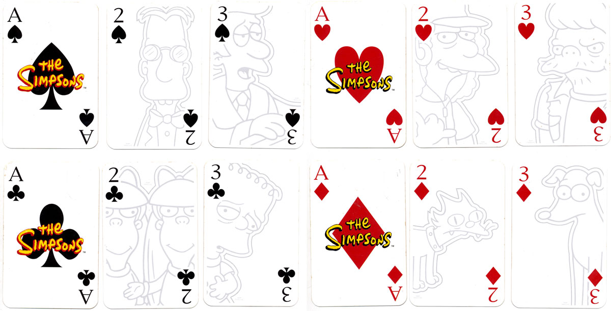 Each suit depicts a particular genre of characters: Spades employees of the nuclear power station; Hearts major supporting adult characters; Clubs characters associated with the school; Diamonds the primary Simpson characters. The number cards also depict supporting characters.