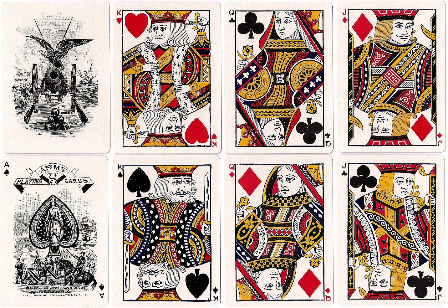 Above: 'Army #303' playing cards published by Russell, Morgan Co., c.1881. The splendid artwork on the Ace of Spades and Joker would have been a strong appeal to loyalty on the part of members of the Armed Forces. An accurate reproduction of this deck was issued in 1981 to commemorate the USPCC's 100th anniversary. Images courtesy Rod Starling.
