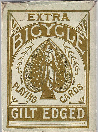 Above: this is the second Ace of Spades used with Bicycle decks, printed by Russell & Morgan Printing Co. c.1889. It has a bicycle wheel motif on the Ace, with the very early and rare Hi Wheeled Joker, as shown, with a Thistle back design and is gold edged. Thistle was issued in red and blue. This particular Thistle design was issued in 1891 and features a grass background. In 1899, the design was changed slightly to include a brick background. It was eventually discontinued in 1931. Note that neither the customary 'US' or 'Joker' inscriptions are present on the Joker. Subsequent editions came with different Jokers. Image courtesy Rod Starling.