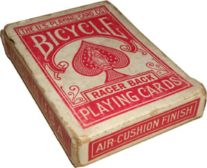 Above: deck of 'Bicycle No.808' playing cards with the Racer back design, c.1928, and with the last type of standard Bicycle Ace of Spades, which is still in use today, albeit with minor modifications. The ace of hearts in this example has the Argentinean importation tax stamp and the name of the importing agents Palmer & Cia overprinted. see more►