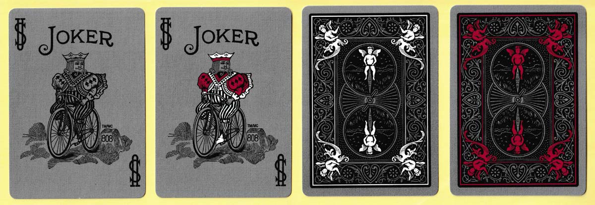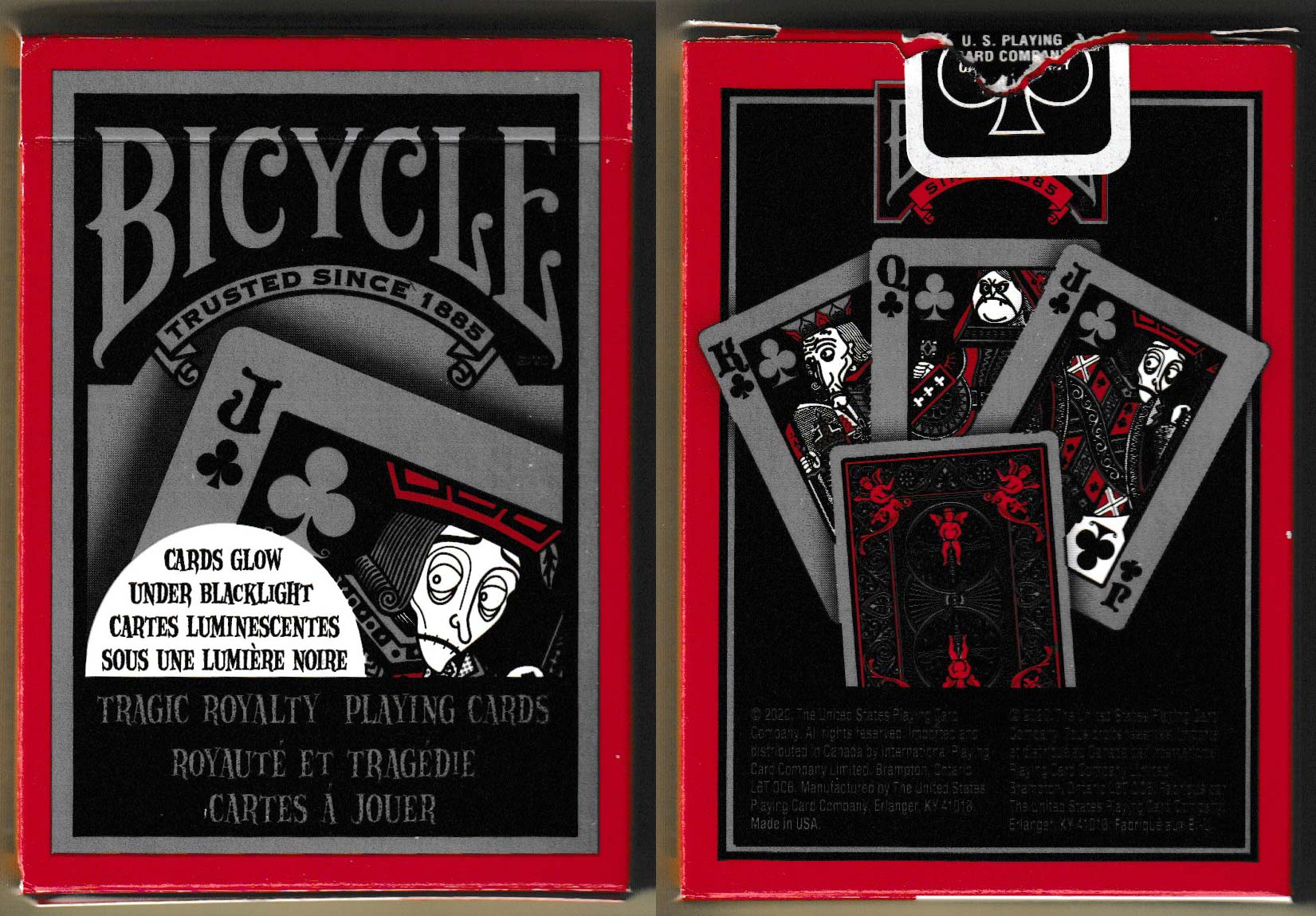 Above: Bicycle Tragic Royalty playing cards printed by the U.S. Playing Card Company, Erlanger, KY, USA, 2020. 52 cards + 2 Jokers + 2 extra cards (one of which is a double backer, the second back design being in black and white only) in tuck box. Size: 63 x 88 mm.
