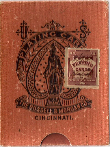 Russell & Morgan's Cabinet No.707 brand was first introduced in 1888 as a 32-card Euchre deck. Brand names such as Congress, Cabinet and Treasury were perhaps designed to give an air of gravity for the serious card player. It may even have been intended to suggest a possible imprimatur by the government for, as we can see, early decks were presented in linen finish generic slip cases with the Statue of Freedom, which was adopted as a trade mark, inside a Spade suit symbol and the words U.S. Playing Cards and The Russell & Morgan Co., Cincinnati printed or embossed on the front. The Ace of Spades is very similar, and reads The Russell & Morgan Ptg Co., Cincinnati. The cards were highly enamelled, gold edges were optional and six colours of backs were available.