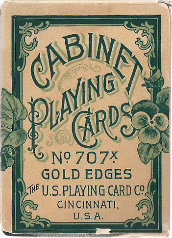 Above: “Cabinet No.707x” playing cards manufactured by the United States Playing Card Co., Cincinnati, c.1902. 52 cards + Joker, gold edges. The monotone scenic backs were an innovation which had been introduced in c.1890. Images courtesy Rod Starling.