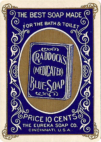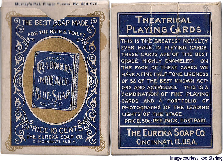 Above: Craddock's Soap Theatrical playing cards, published in 1895 by the Eureka Soap Co., Cincinnati. The advertiser did not allow the manufacturer to print its name anywhere on the deck. They felt that since they were paying for the entire cost of the deck, they would not let the manufacturer get a ‘free ride' by advertising it's name on the deck. However, we are able to tell that he deck was made by U.S.P.C.C. by reference to the flap on the box where is printed “Murray’s Pat. Finger Recess No.434,878”. Images courtesy Rod Starling.
