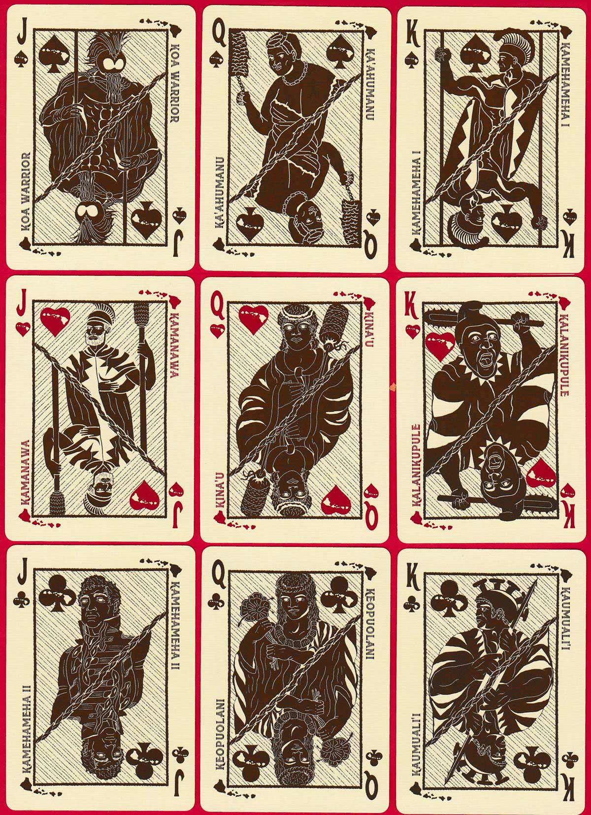 These playing cards were carefully researched by Scott Mijares (designer) and drawn by Scott Westmoreland, a retired Disney illustrator, and are in the art style of classic Hawaiian wood carvings. The court cards feature Hawaiian royalty, chieftains and historical warriors from the past. Kamehameha I, the first king to unite the Hawaiian Islands, is portrayed on the ace of spades and the card backs.