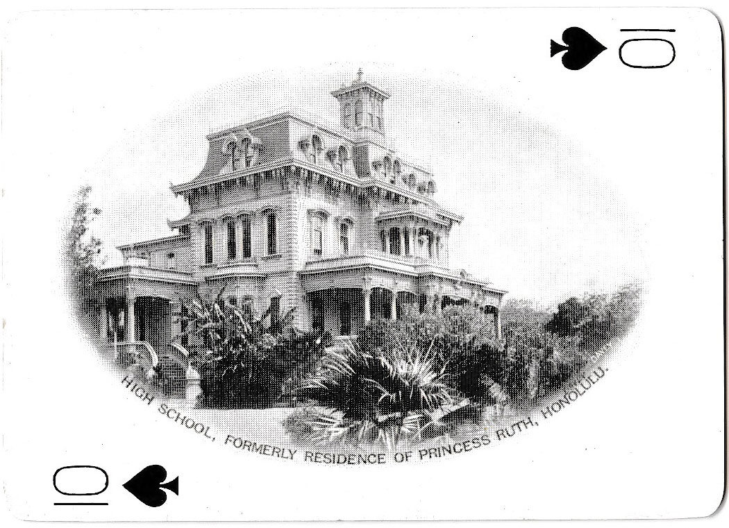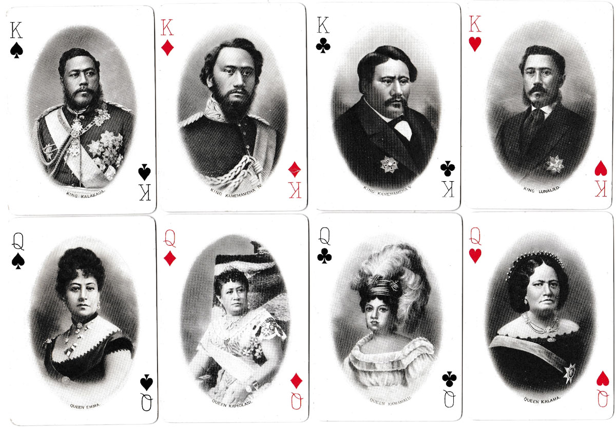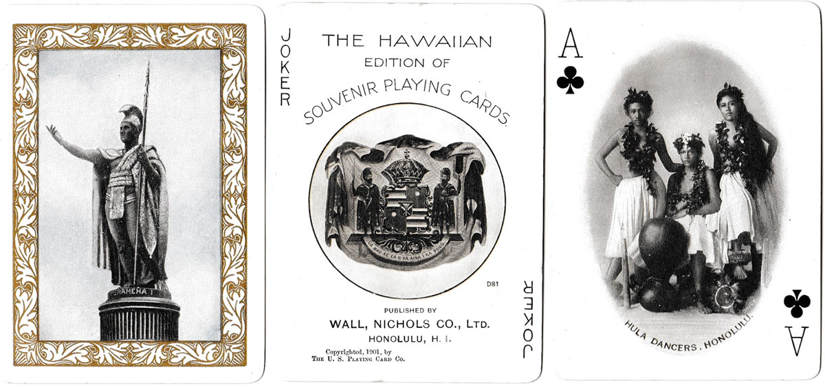 Hawaiian Souvenir playing cards published by Wall, Nichols Co., Ltd. of Honolulu and copyrighted 1901 by the U.S. Playing Card Company. The reverse has a statue of King Kamehameha, surrounded by a gold frame. The Kings and Queens show oval photos of members of the Hawaiian royal dynasty while other cards portray oval photo scenes (with no outline border) of early Hawaii. The Joker shows the seal of Hawaii, consisting of a crown resting above a shield, ornamented with kalo leaves, symbolizing the monarchy. The two male figures on either side of the shield dressed in 'ahu 'ula (feather cloaks) and mahiole (feathered helmets) are the sacred royal twin brothers, Kame'eiamoku and Kamanawa. These two chiefs helped Kamehameha I come to power. Beneath is the motto ‘Ua mau ke ea o ka aina i ka pono meaning “The life of the land is perpetuated by righteousness”.