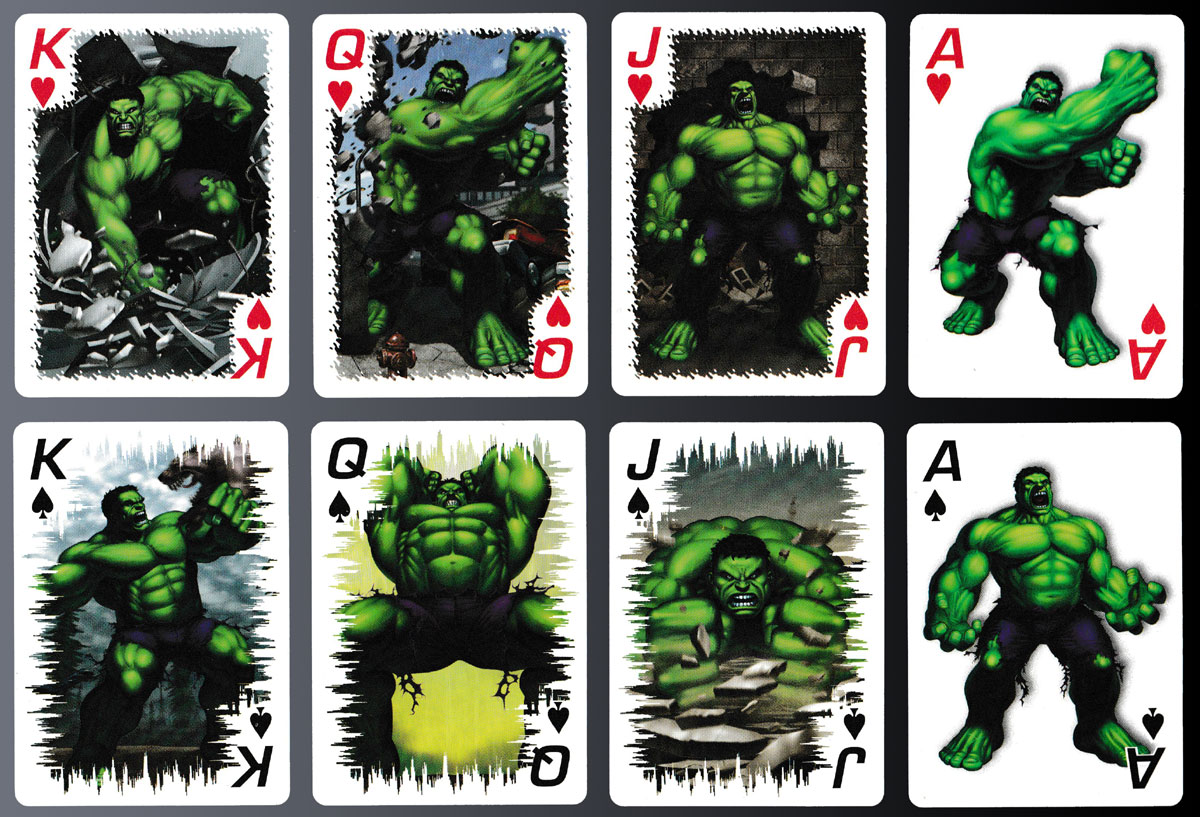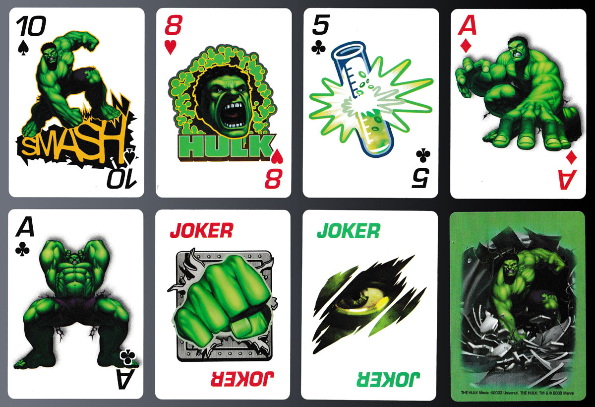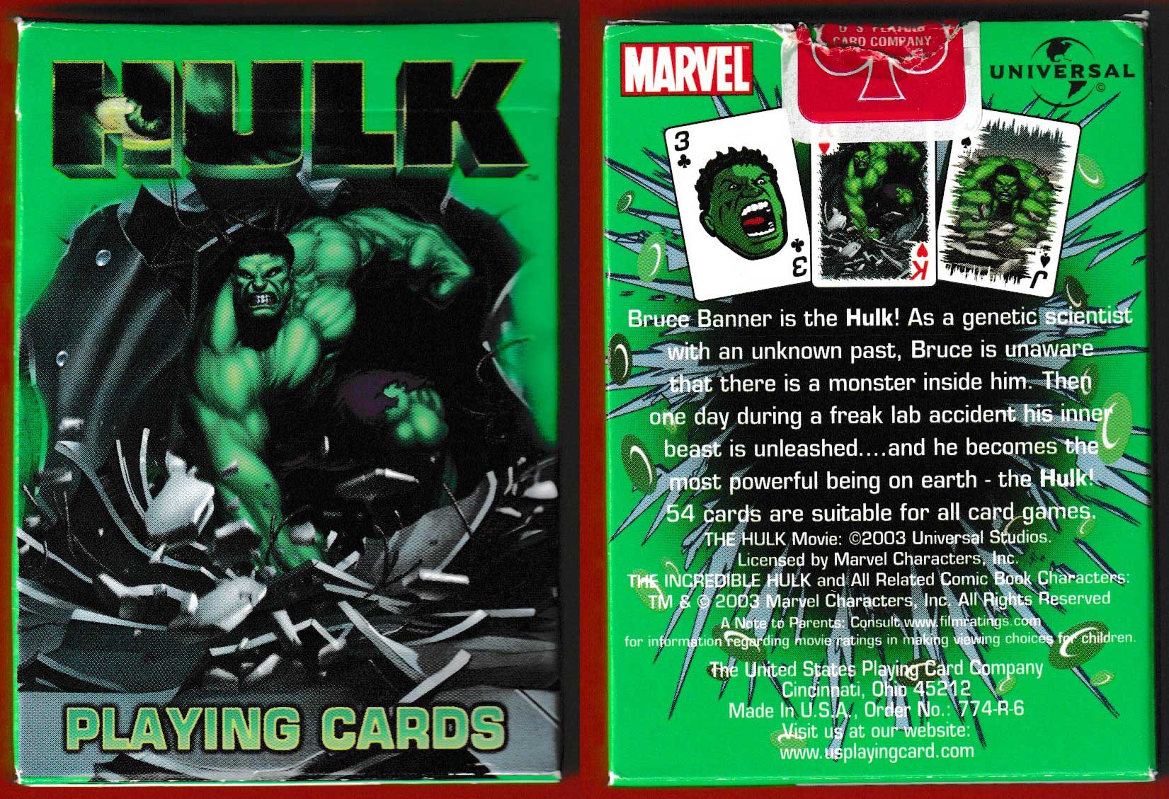 Above: Hulk playing cards made by USPC Co., Cincinnati, OH, USA, 2003. 52 cards + 2 Jokers + 2 extra cards in tuck box. Size: 63 x 88 mm. THE HULK Movie: ©2003 Universal. THE HULK: TM & ©2003 Marvel.