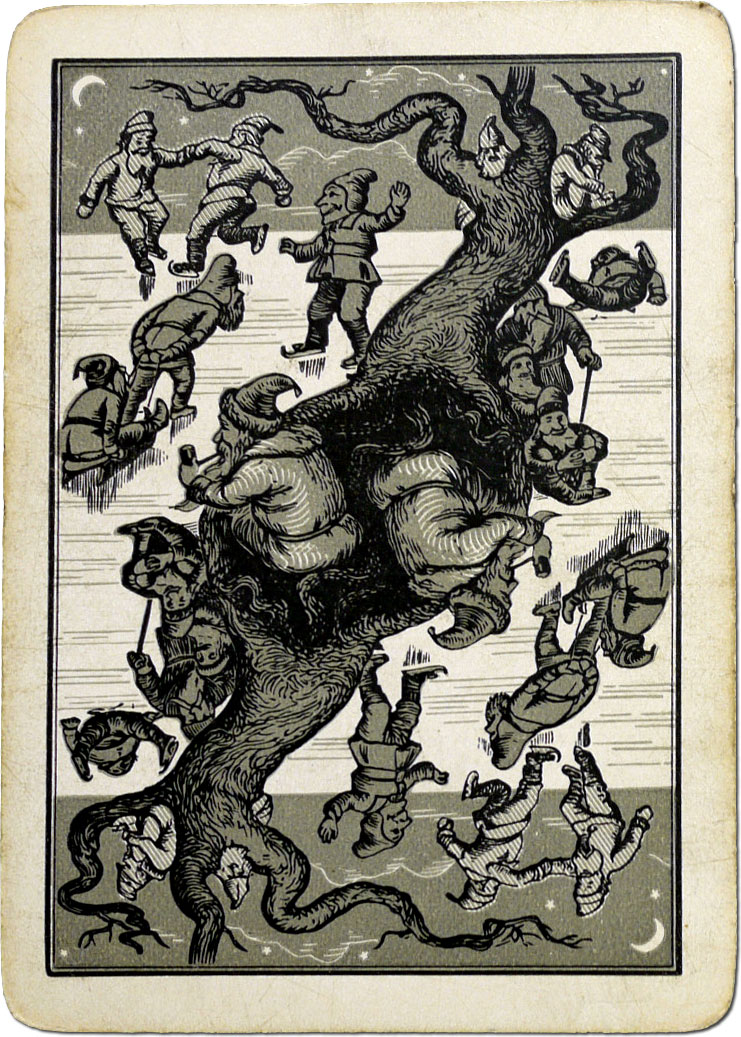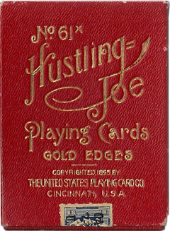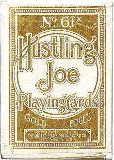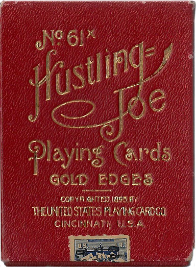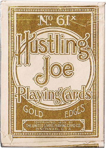 Above: the first edition of Hustling Joe No.61 published by the United States Playing Card Co, Cincinnati, Ohio, 1895. While in the first issue of the deck his costume as seen on the Ace of Spades is red, a second edition was immediately issued to correct some design flaws found in the first edition and his costume was changed to yellow. The back design is a double-ended black and white scene of gnomes ice skating in the moonlight. The wrapper is printed in gold, and the deck has gold edges, as stated on the box.