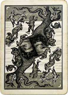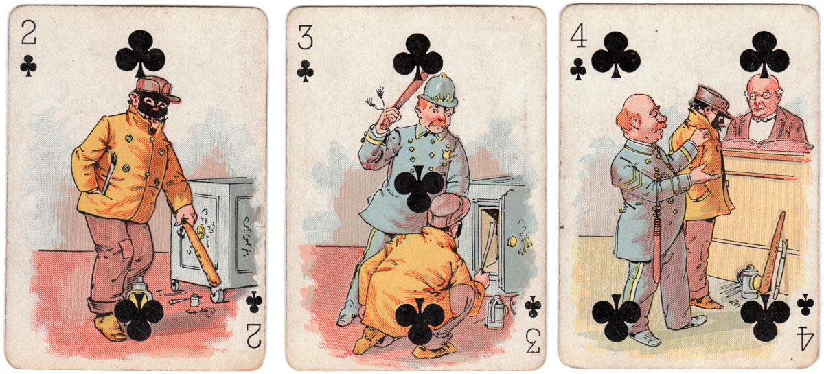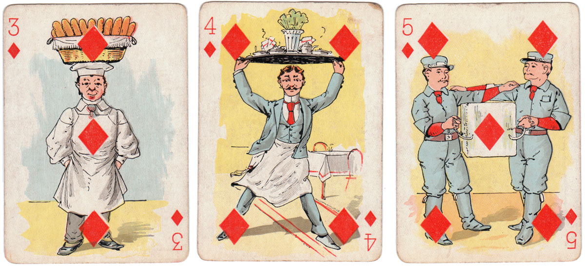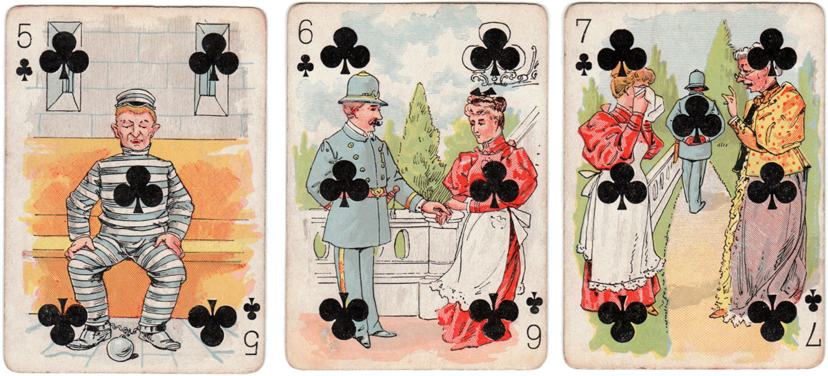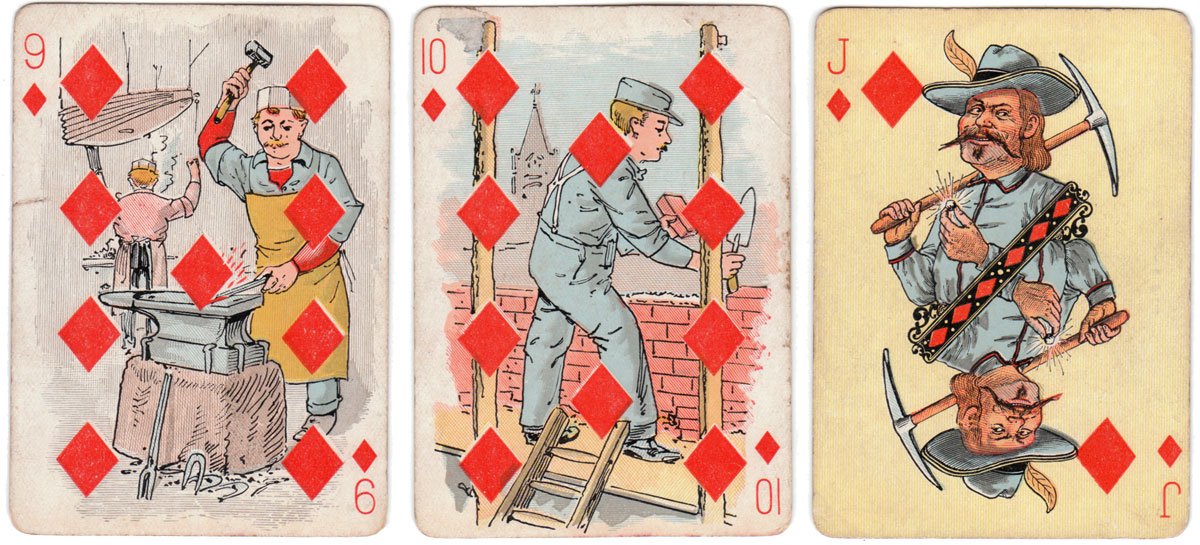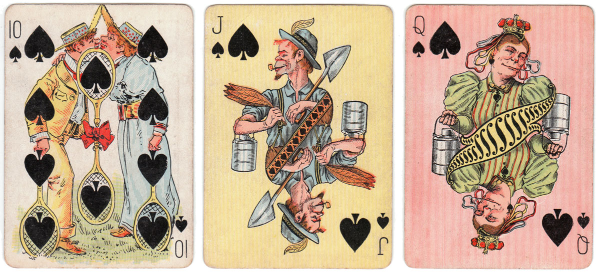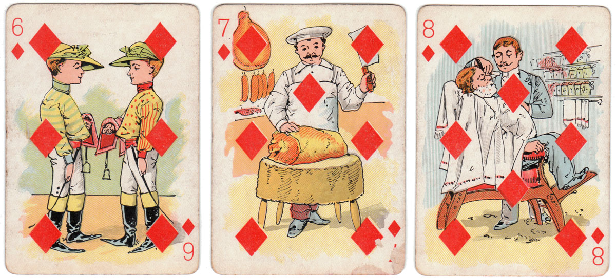 Hustling is the deceptive act of disguising one's skill with the intent of luring someone to gamble with the hustler, as a form of confidence trick. Hustling Joe himself appears on the Ace of Spades dressed in red. The Joker may be an accomplice in the scam. The non-standard and slightly comical court cards have different coloured backgrounds in each suit, and each pip card features a unique and amusing scene which tells a story. But this is not quite a Transformation deck in the true sense as the pips are not properly integrated into the designs. Nevertheless the cards have a certain charm which would have appealed to children if not to serious card players.